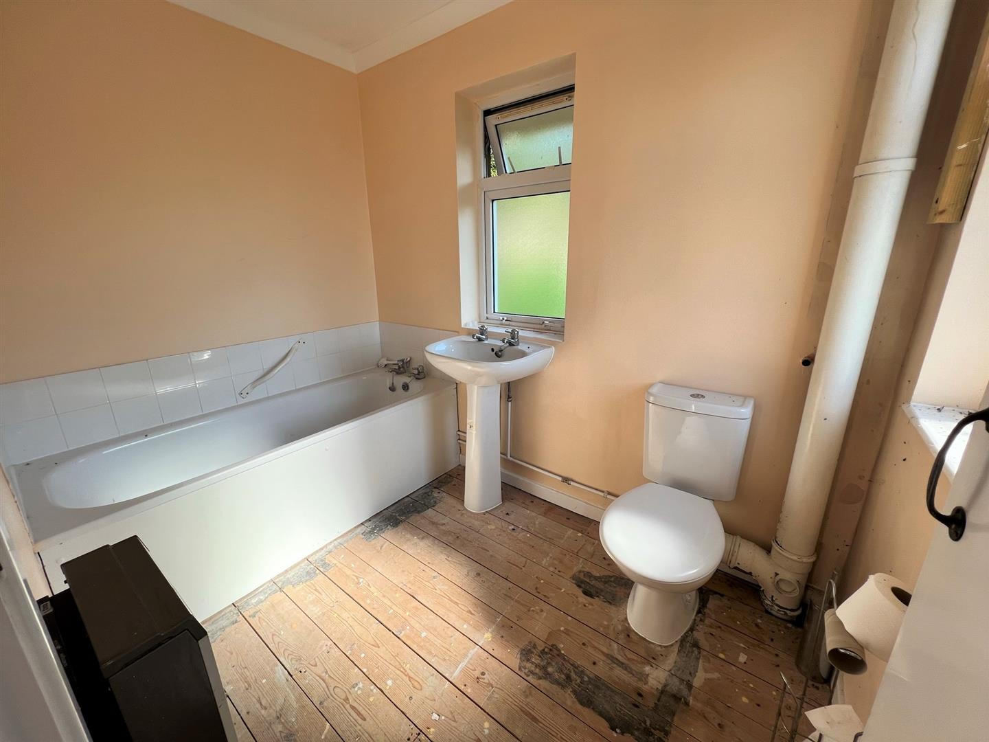 Bathroom - 2.46m x 1.68m (8'01 x 5'06) - White suite with modern close coupled w.c, pedestal wash hand basin, modern side panel bath with tiled surround and taps over, wall mounted night storage heater, ceiling light, coving, side and rear aspect single glazed obscure windows.
