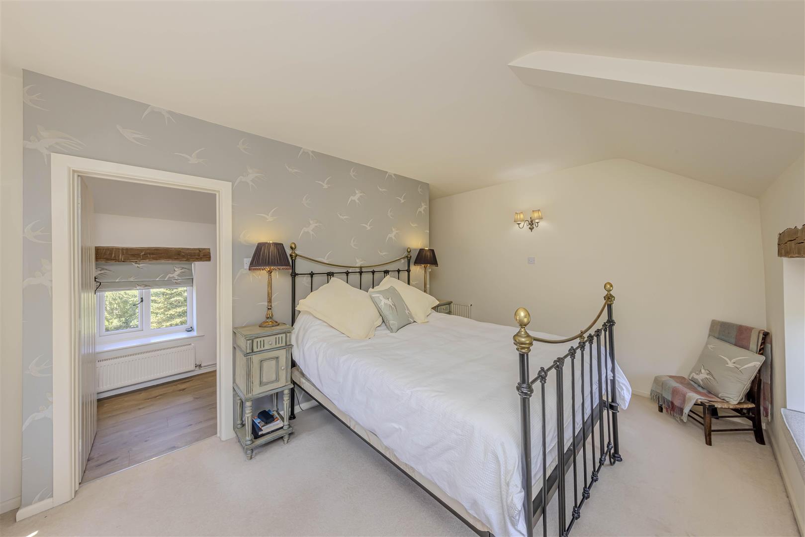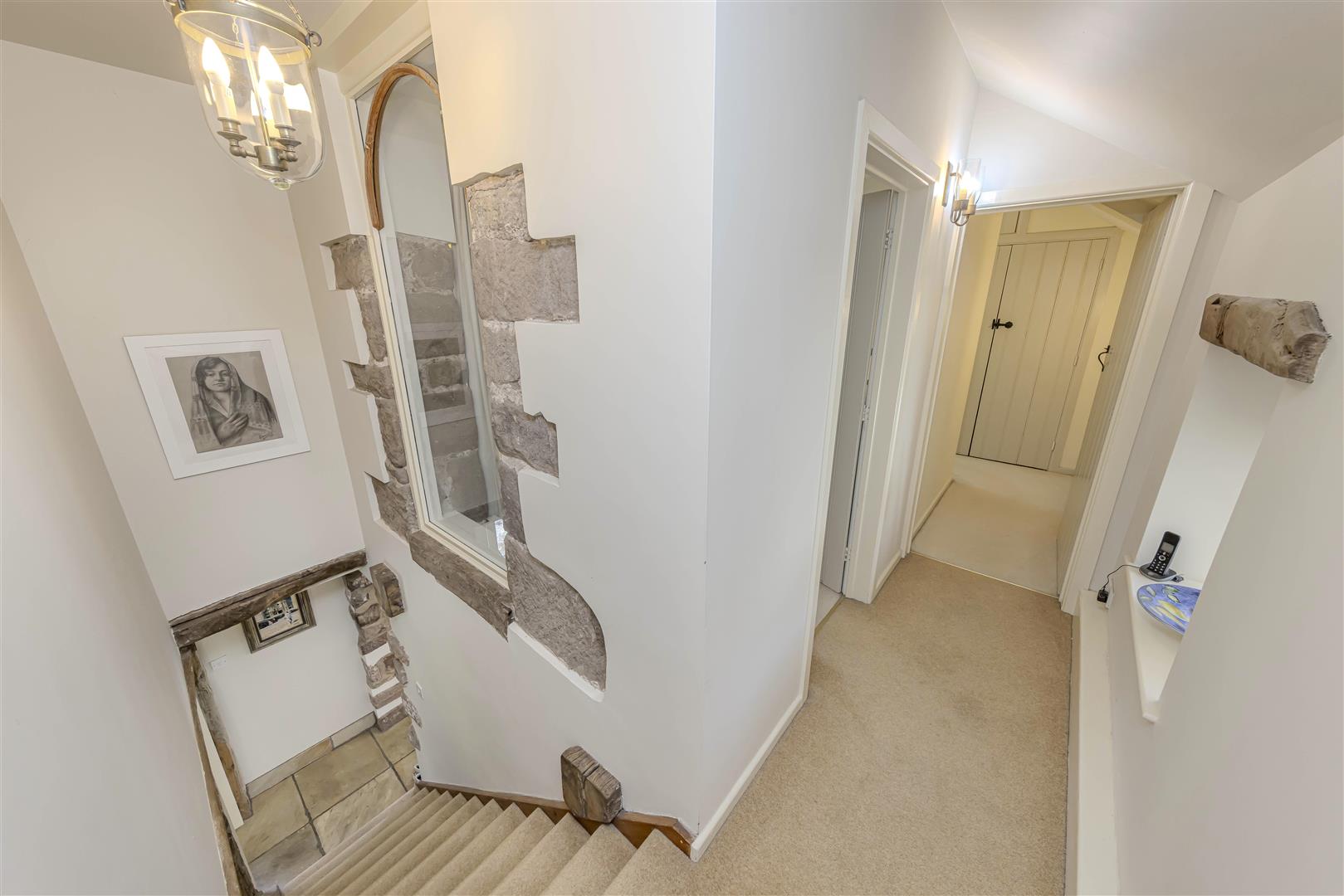 First Floor Accommodation - On the first floor, the landing has a fitted carpet and provides access to three well-appointed bedrooms and a family bathroom. A window overlooking the rear garden and exposed beam detailing adds character, while an internal window above the staircase offers a glimpse into bedroom three, framed by exposed stone. The landing is illuminated by a ceiling light and additional wall lights.