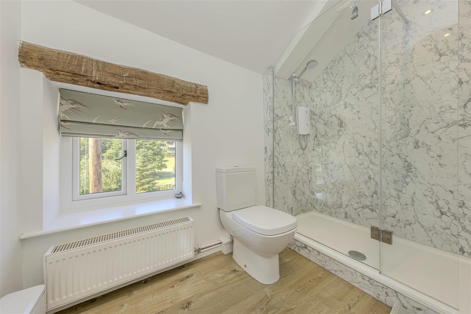En-Suite - 3.08 x 1.66 (10'1" x 5'5") - The en-suite bathroom is a modern suite, equipped with a double shower featuring glass doors for a contemporary touch. It includes a WC and a stylish vanity wash hand basin with storage underneath., The space has a radiator and exposed wooden-style flooring. A window is located to the rear aspect with an exposed beam overhead, allows for natural light. Inset spotlights provide additional illumination.