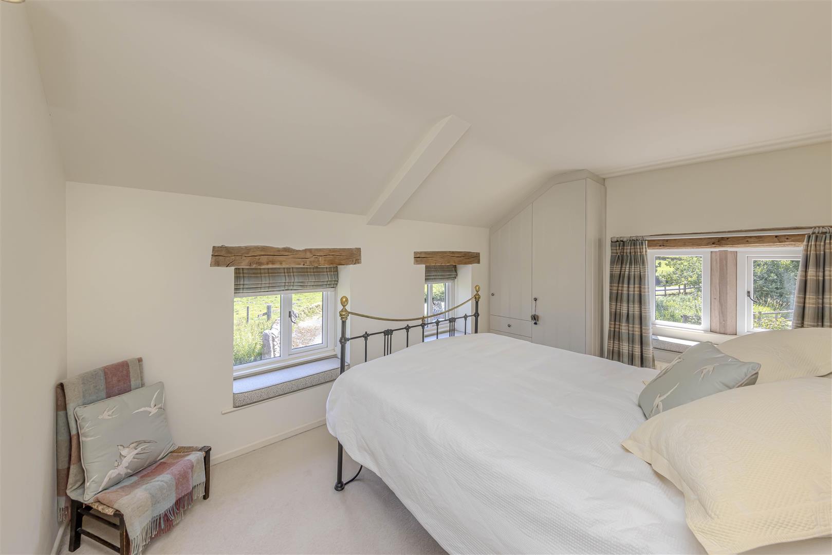 Bedroom One - 4.63 x 4.70 max naroowing to 2.90 (15'2" x 15'5" m - This spacious double bedroom has a fitted carpet, two windows facing the front, which not only flood the room with natural light but also the sills can be used as charming window seats. The room is enhanced by exposed beams that add character and a rustic touch. An additional side window with a stone mullion divider further complements the ambiance. For convenience, there is a fitted wardrobe with drawers and storage above, as well as a radiator to ensure a cosy environment. Access to the en-suite shower room makes this room functional for many buyers.