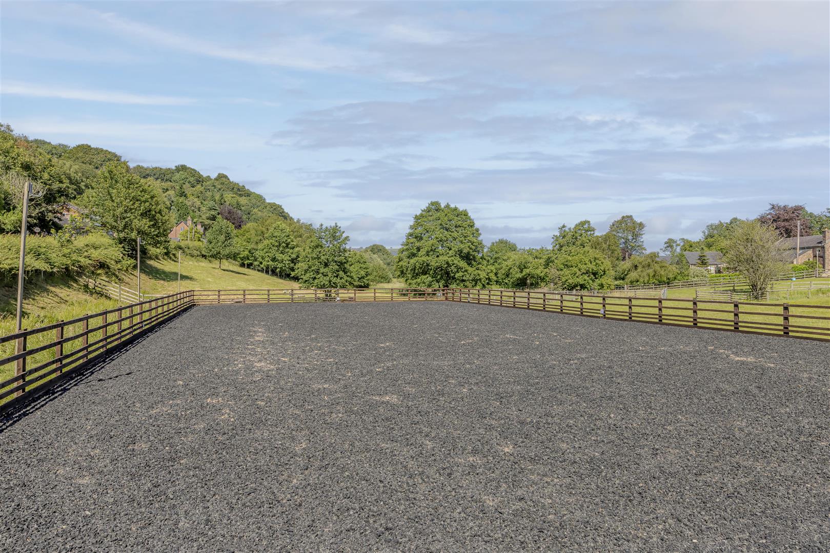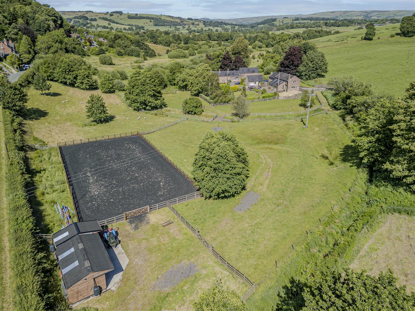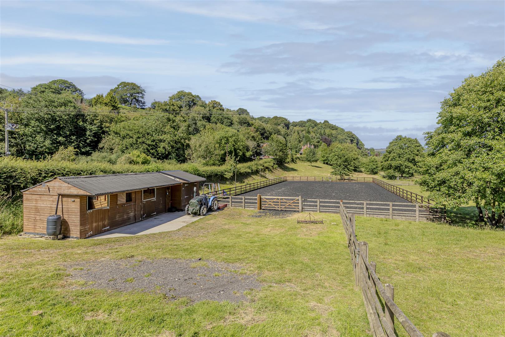 Land - Behind the property lies additional land, split into paddock areas ideal for grazing or equestrian use. Gated access from the country road leads directly to this land, which includes two substantial stables with an adjacent tack room for storage of equipment and hay. The paddocks are designed for easy management, and the property features a purpose-built 20x20 arena that boasts adequate drainage and a well-maintained surface, suitable for various equestrian activities. There is also a field shelter.