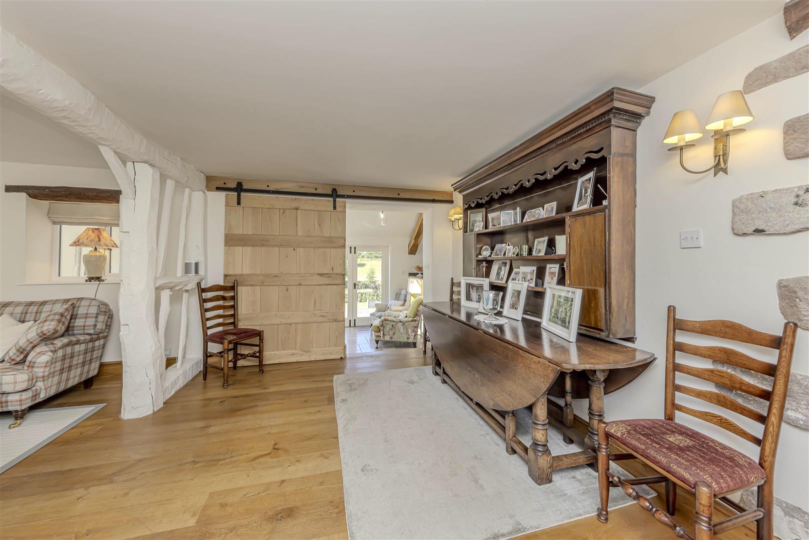 Dining Area - 4.68 x 3.15 (15'4" x 10'4") - The exposed oak flooring continues from the sitting room into the dining room. Windows to the front aspect, also divided by stone mullions, provide the area with natural light. Additional features include a radiator and wall lights that enhance the inviting atmosphere. The space is completed with a stable-style sliding door, providing direct access to the open plan dining kitchen, making it perfect for entertaining and family gatherings.