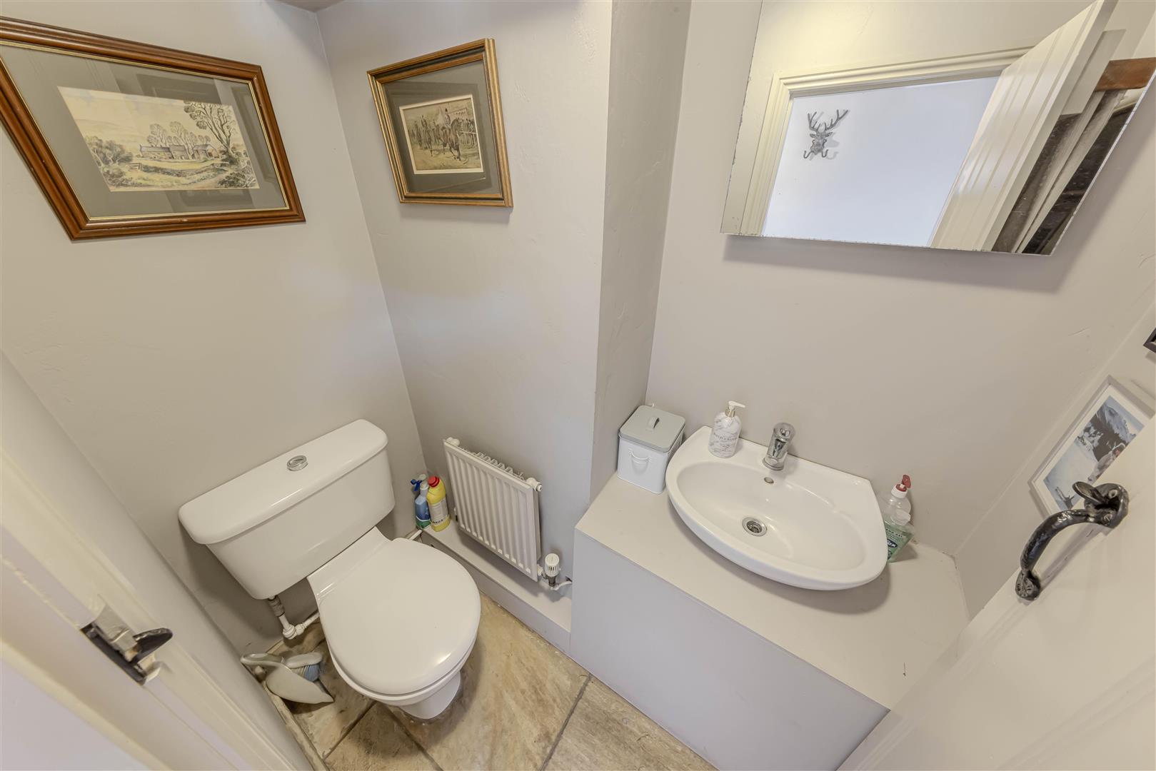 Ground Floor Cloakroom - 1.12 x 1.77 (3'8" x 5'9") - The ground floor cloakroom is practical and modern, housing a WC, radiator, wash hand basin, and ceiling light, all featuring the continuation of the stone design tiled flooring.