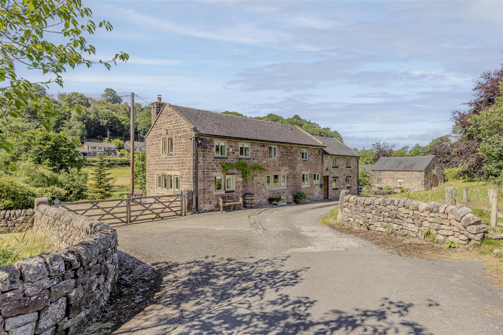 "In Harmony," this delightful property resonates beautifully with its history and surroundings, featuring elegantly designed interiors and a bespoke extension that offers stunning views of the breathtaking gardens. This detached stone home perfectly enhances its enchanting character and serene environment. With approximately 3 acres of land, plus it's expansive gardens, stables, and an arena, makes it an ideal haven for equestrian enthusiasts!