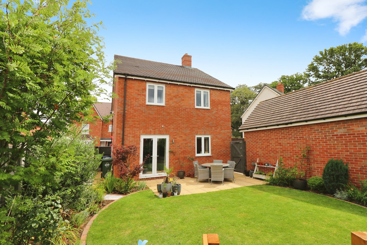 To the front is the driveway and a garage, to the rear is the landscaped garden.