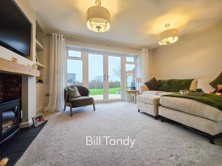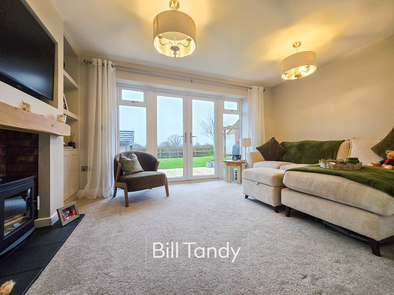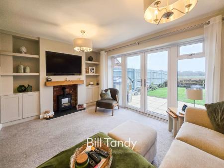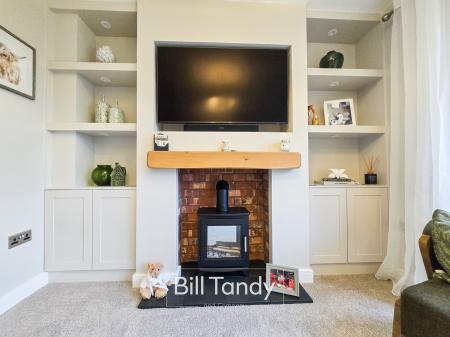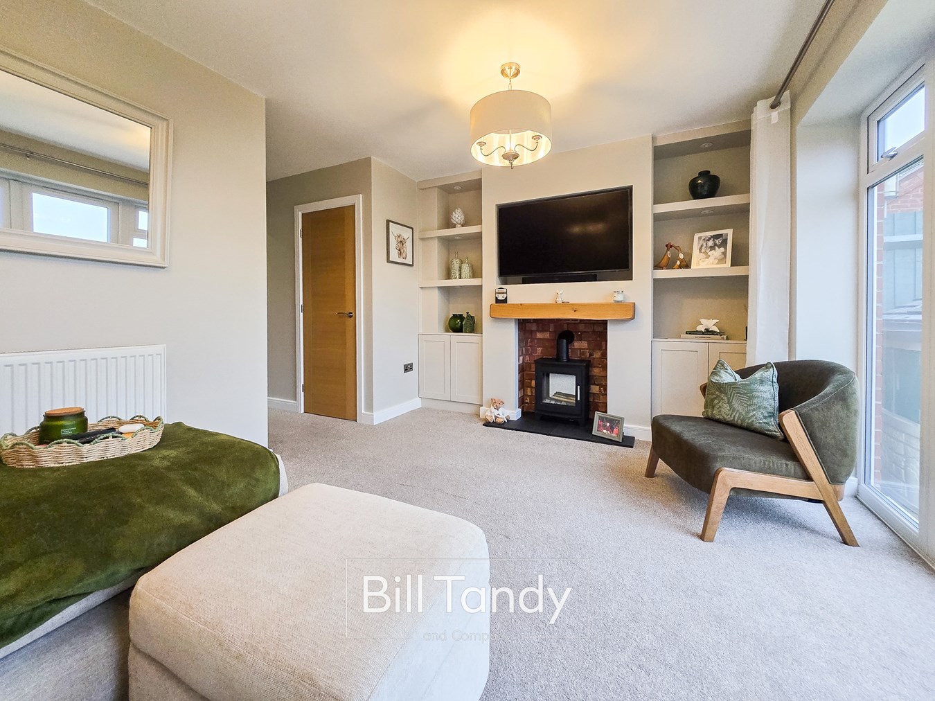4.50m max (2.95m min) x 4.47m (14' 9" max 9'8" min x 14' 8") having double glazed windows and French doors to rear garden, under stairs store cupboard, radiator, media wall with inset fire recess having a log burner style electric fire with brick inset and tiled hearth and wooden mantel beam above, recess ideal for wall mounted T.V. and base storage with shelving and spotlighting.