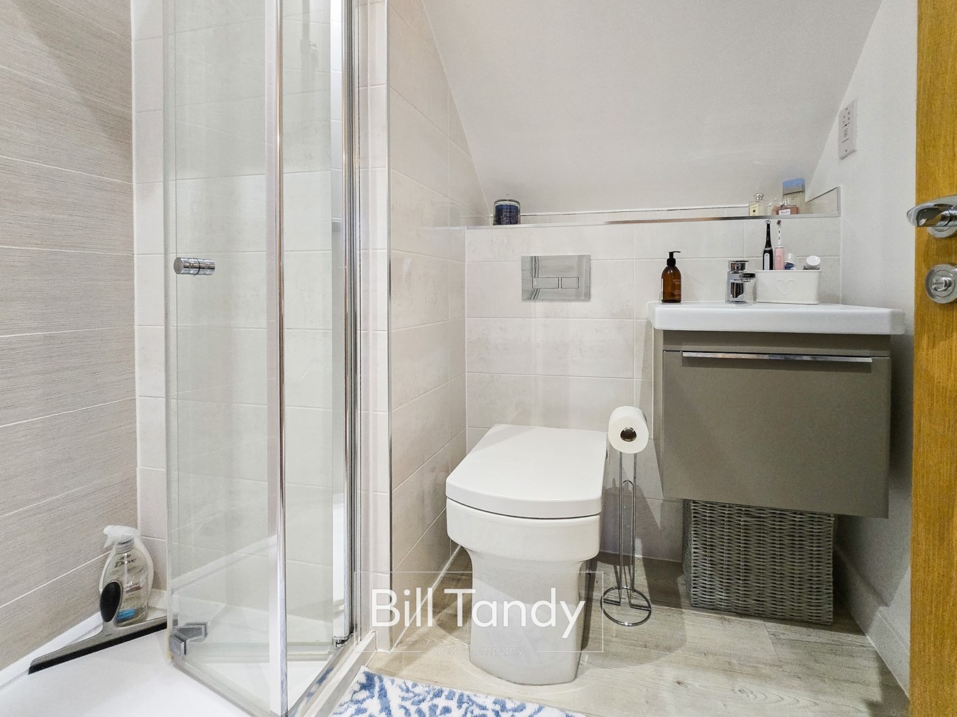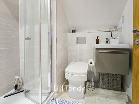 1.99m x 1.64m into reduced ceiling height (6' 6" x 5' 5" into reduced ceiling height) having LVT floor, chrome heated towel rail, spotlighting to ceiling and contemporary suite comprising wall mounted wash hand basin with vanity unit below, low flush W.C. and shower cubicle with twin-headed shower appliance and tiled surround.
