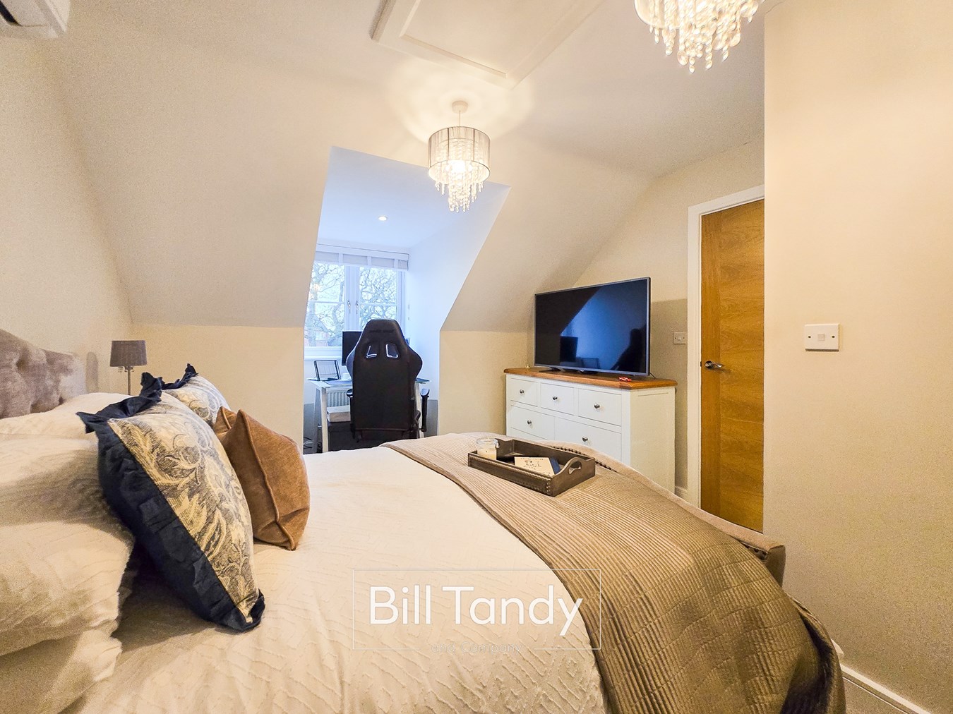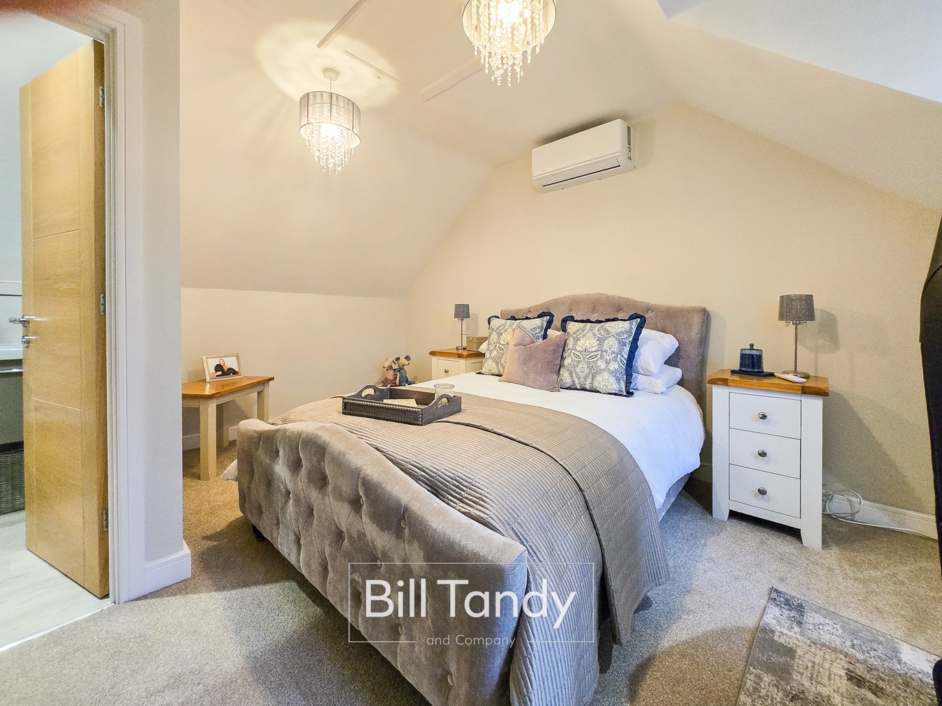 5.05m max into reduced ceiling height x 3.41m (16' 7" max into reduced ceiling height x 11' 2") having double glazed window to front, radiator, two ceiling light points, additional spotlighting, loft access, and an air-conditioning unit providing both cold and warm air. Door to: