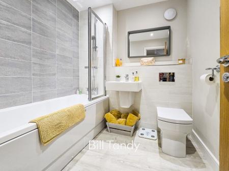 2.12m x 1.93m (6' 11" x 6' 4") having LVT floor, spotlighting to ceiling, chrome heated towel rail, suite comprising wall mounted wash hand basin with tiled splashback surround, low flush W.C. and bath with shower appliance over and shower screen.