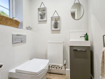 having an obscure double glazed window to front, radiator, LVT tiled floor, spotlighting to ceiling and modern suite comprising vanity unit with inset wash hand basin and low flush W.C.