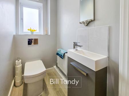 having LVT floor flowing through from the dining kitchen, radiator, obscure double glazed window to side, spotlighting and suite comprising vanity unit with inset wash hand basin with tiled surround and low flush W.C.