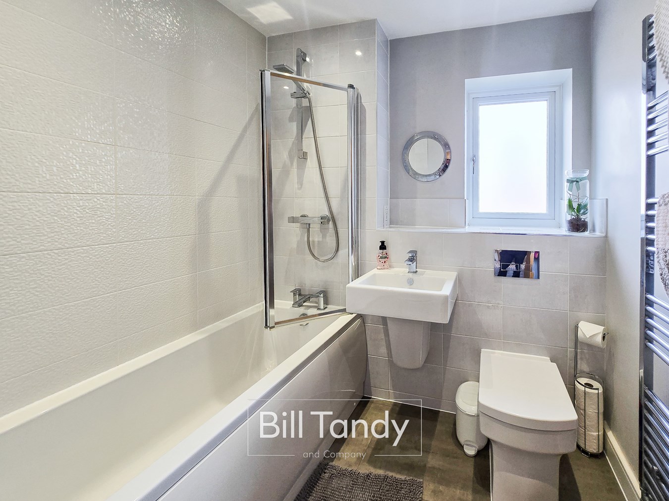 having LVT floor, obscure double glazed window to side, chrome heated towel rail, suite comprising wall mounted wash hand basin with tiled surround, low flush W.C. and bath with shower appliance over and shower screen, tiled splashback surround and spotlighting.