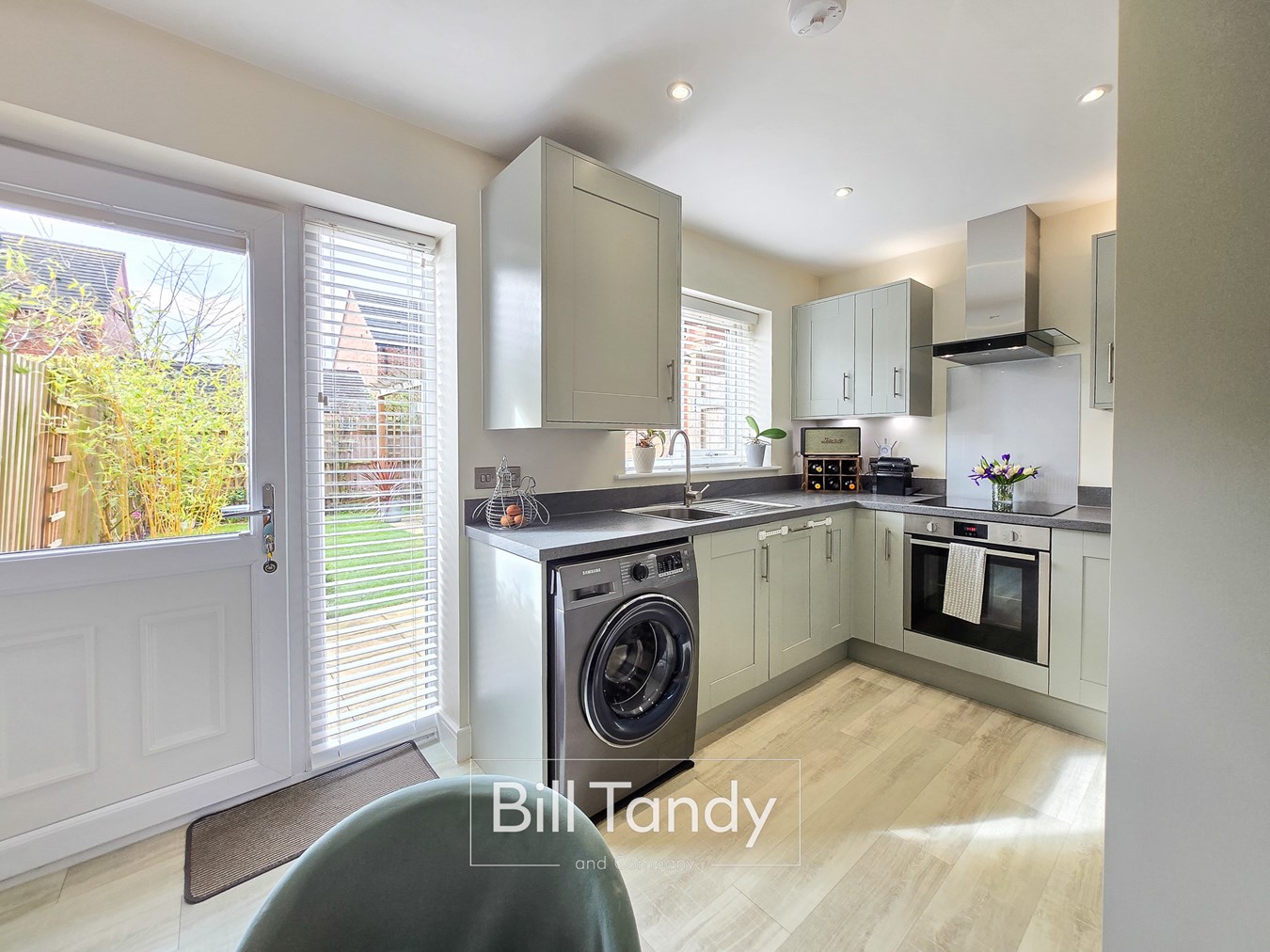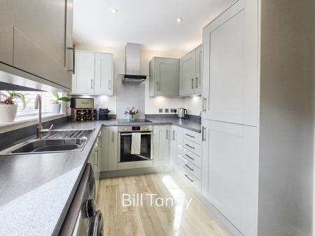 4.13m x 3.56m (13' 7" x 11' 8") having double glazed window, door to rear garden , LVT floor, radiator, useful under stairs store cupboard, spotlighting to ceiling, grey Shaker style kitchen units comprising base cupboards and drawers with round edge work tops above, matching wall mounted cupboards, inset stainless steel sink, inset oven with four ring electric induction hob with glass splashback surround and extractor fan, integrated fridge/freezer and dishwasher, space for washing machine, concealed space housing the Ideal boiler and door to: