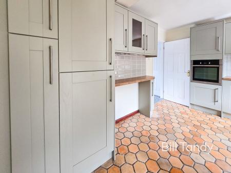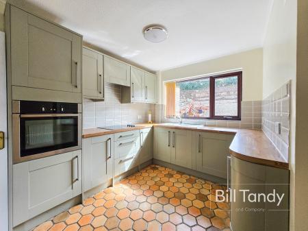 3.48m x 2.56m (11' 5" x 8' 5") superbly improved and updated with a range of contemporary Shakes style units comprising base cupboards and drawers surmounted by wooden style style preparation tops, tiled splashback surround, wall mounted cupboards, inset sink with drainer, inset Neff oven with electric hob, tiled floor, radiator, breakfast bar area and door to rear garden.