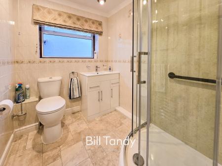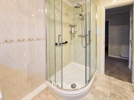 2.39m x 1.79m (7' 10" x 5' 10") having an obscure double glazed window to side, chrome heated towel rail and suite comprising vanity unit with wash hand basin above, low flush W.C. and shower enclosure with twin-headed shower appliance over and aqua-boarding surround.