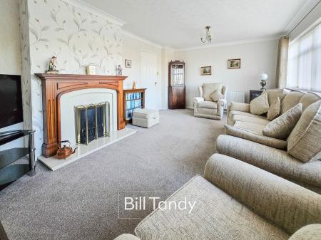 5.53m x 3.64m (18' 2" x 11' 11") having double glazed picture window to front, two radiators and a feature and focal point fireplace with cream marble hearth and inset, wooden surround and mantel above housing a flame effect gas fire.