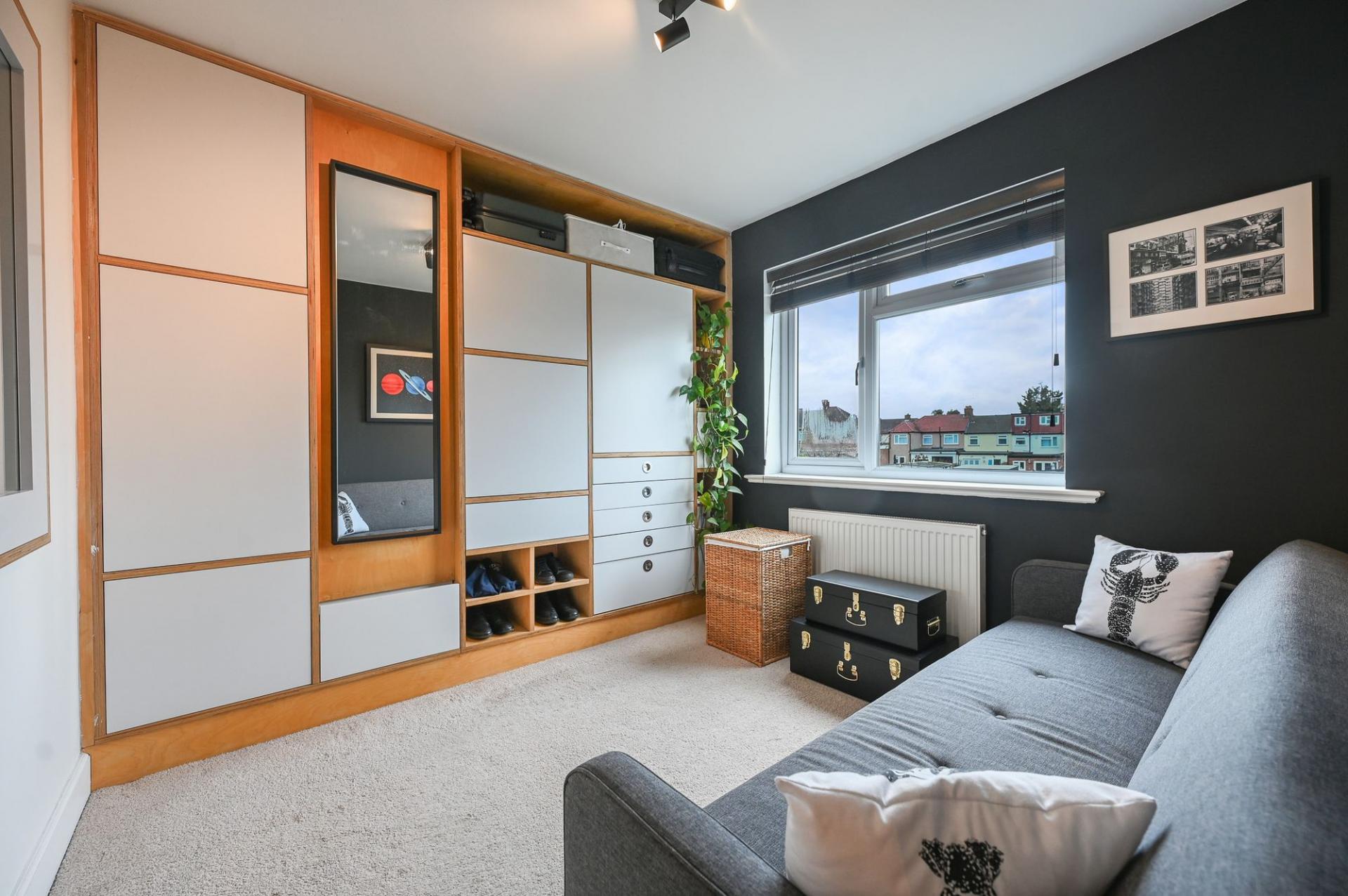 To the rear, a private garden awaits, along with an outbuilding. Fully insulated and fitted with underfloor heating, this versatile space could serve as a home office, gym, or creative studio — offering ample possibilities for the modern homeowner.