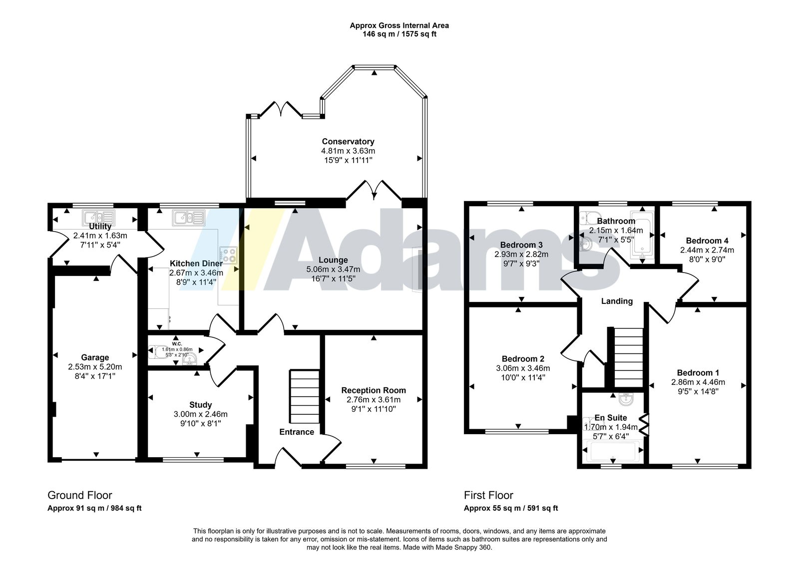 The internal accommodation comprises, to the ground floor: a welcoming entrance hall, spacious lounge, reception room, study, downstairs WC, and a well-equipped kitchen with adjoining utility room. A conservatory to the rear provides an additional light-filled living space, ideal for relaxation or entertaining.