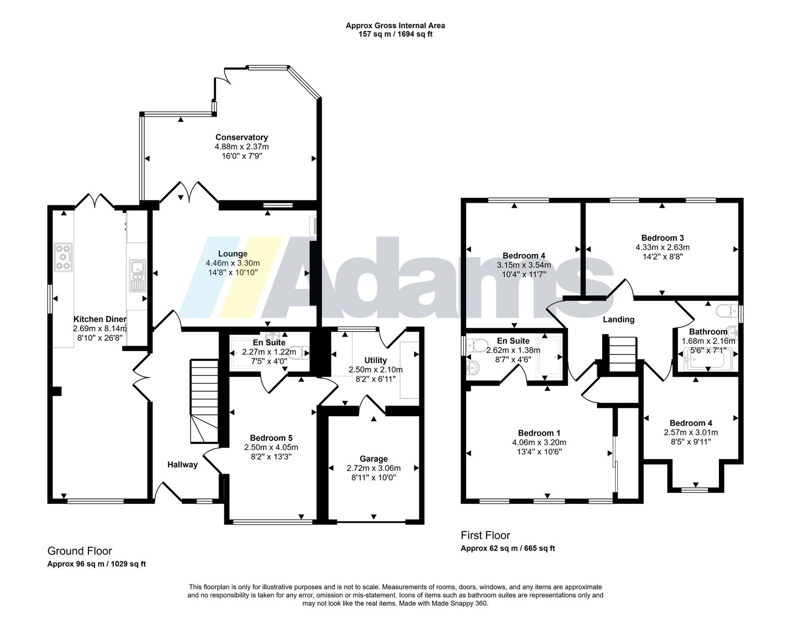 The ground floor accommodation comprises an inviting entrance hallway, lounge, conservatory, and open-plan kitchen/dining area. A versatile fifth bedroom with its own ensuite bathroom adds flexibility, ideal for guests or multigenerational living. Additional ground floor features include a utility room and a split garage, providing excellent storage solutions.
