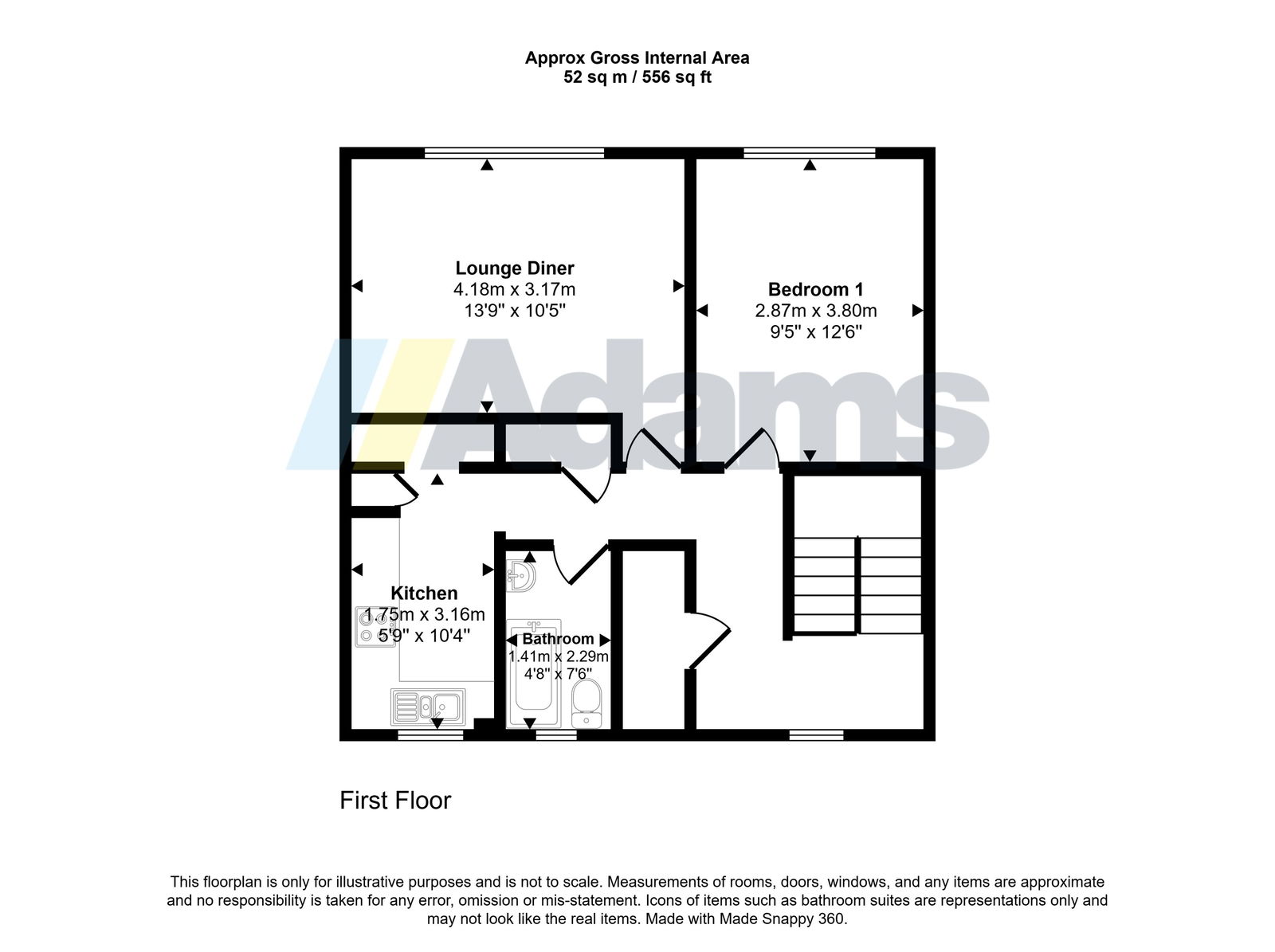 The accommodation comprises a ground floor entrance hall with stairs leading to the first-floor landing, which benefits from a large storage cupboard and provides access to all principal rooms. The flat includes a generous lounge, double bedroom, bathroom, and kitchen.