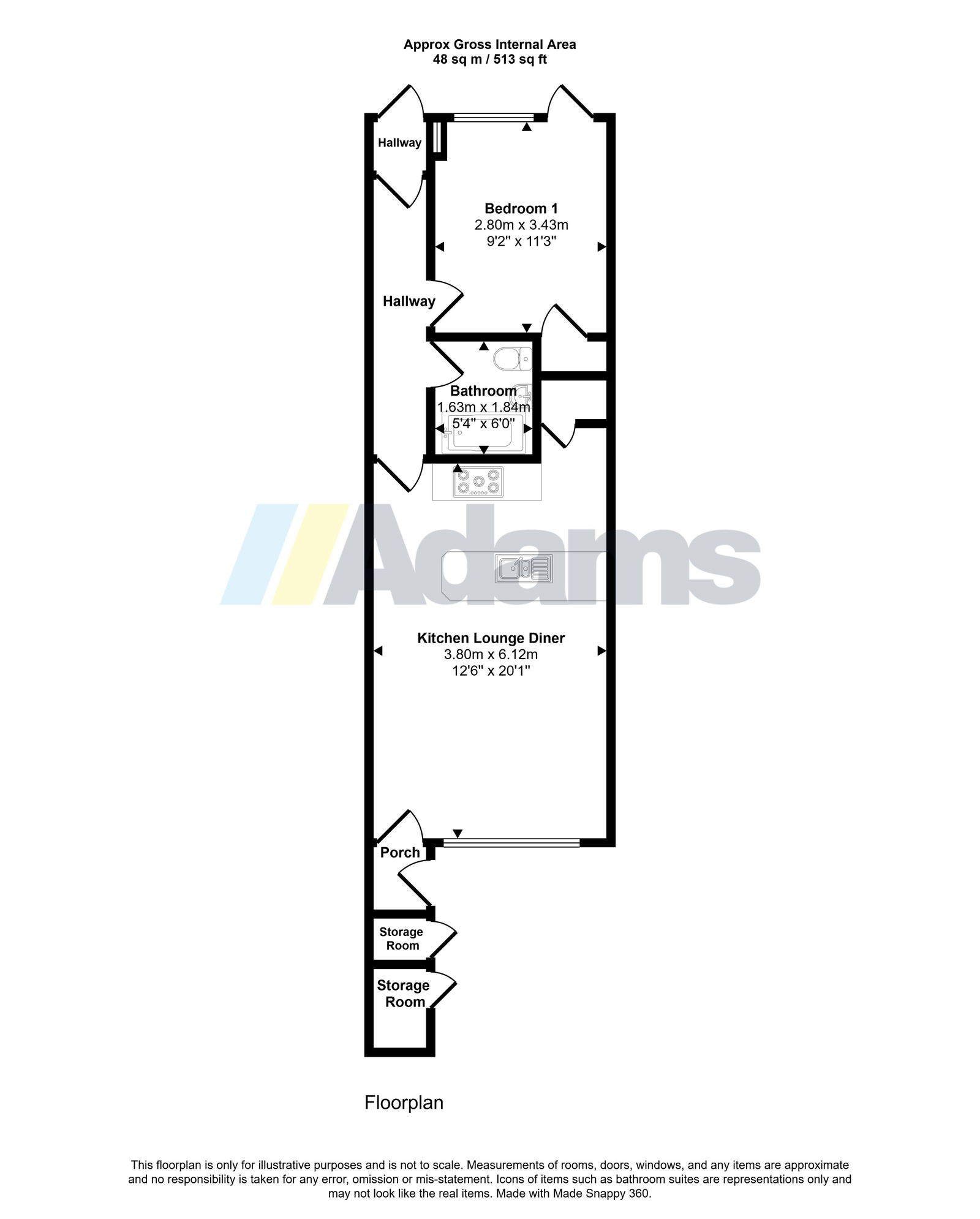 In brief, the accommodation comprises: entrance porch, open plan lounge, kitchen and dining area, inner hallway, bedroom, and bathroom.