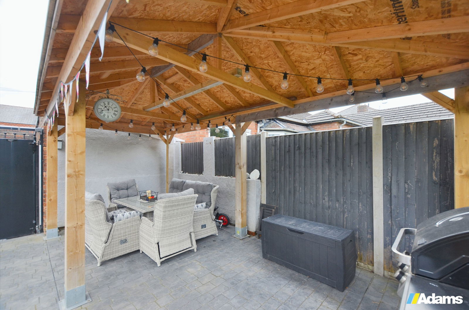 Externally, the property enjoys a prime position within ample grounds. A driveway to the front provides excellent off-road parking and access to the garage. To the rear, a substantial south-facing garden awaits, boasting a large patio area with a timber pergola and enclosed roof—perfect for entertaining, dining, or relaxing in style.