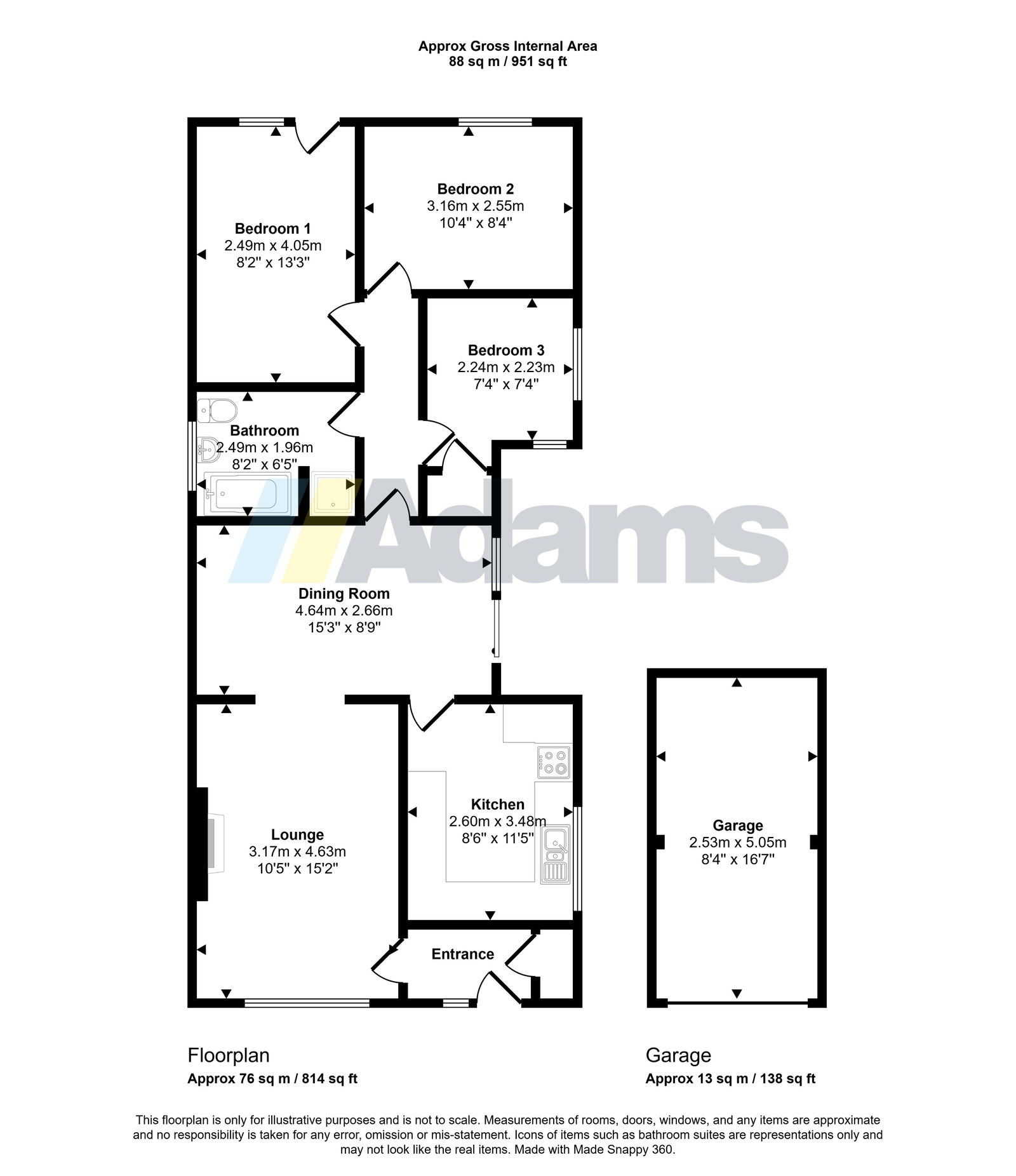The deceptively spacious layout comprises an entrance porch, hallway, lounge opening into the dining area, kitchen, three double bedrooms, and a four-piece family bathroom.