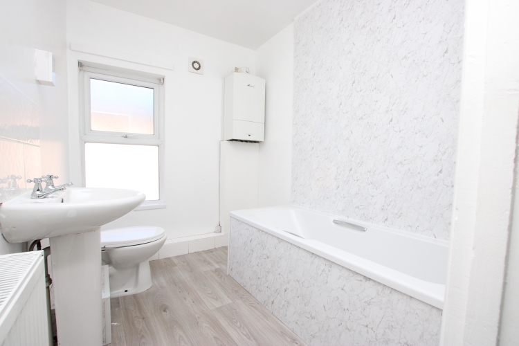 Obscure double glazed window to rear aspect, bath unit with panelled surrounds, pedestal wash basin, low-level W/C, radiator, Worcester boiler system