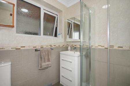 Shower Room: UPVC obscure glazed window to the side. Fitted with contemporary white suite comprising WC, hand basin set into white, high gloss storage unit and shower cubicle. Coved ceiling. Tiled walls, vinyl floor.