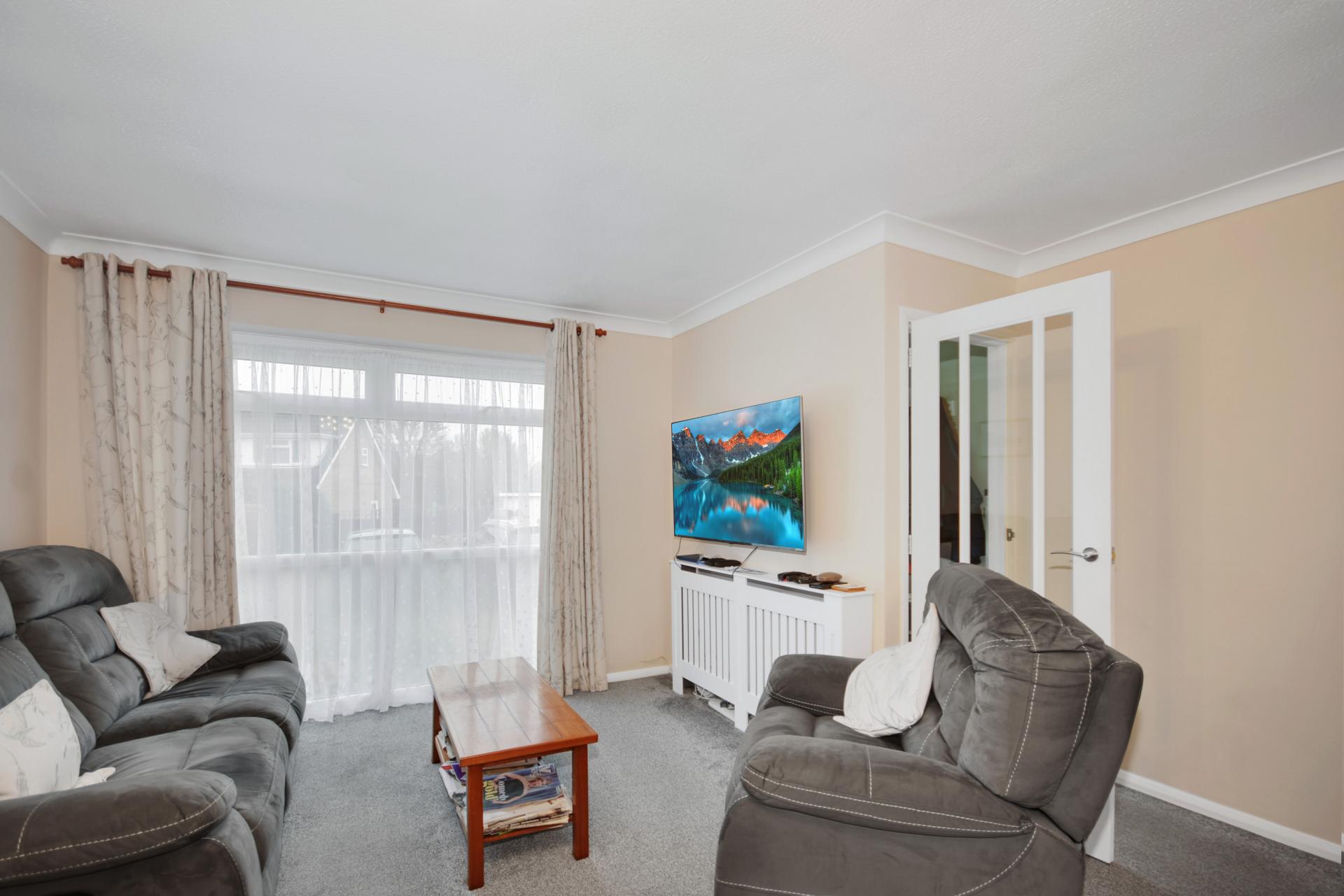 Outside: The property is approached over a pathway leading to the front door with an area of level lawn to the side. The rear garden is fully enclosed with paved terrace and screened oil tank. A gate at the rear boundary gives access to a path leading to the single garage en bloc.