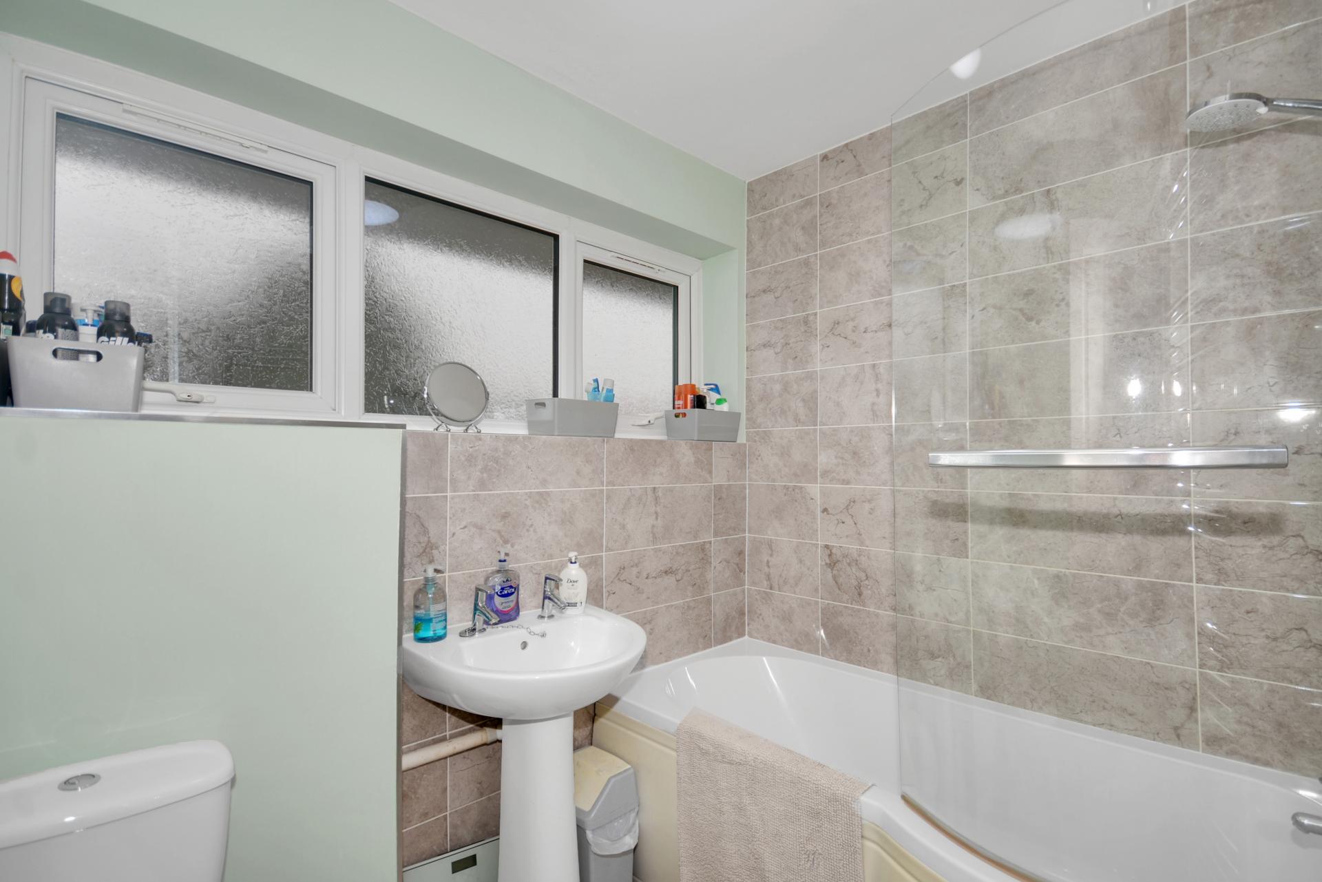 Bath/Shower Room: Obscure UPVC double glazed window to the rear. Fitted with white suite comprising WC, pedestal hand basin & shower bath with Triton shower over, curved shower screen to side. Part tiled walls. Vinyl floor. Ladder style heated towel rail.