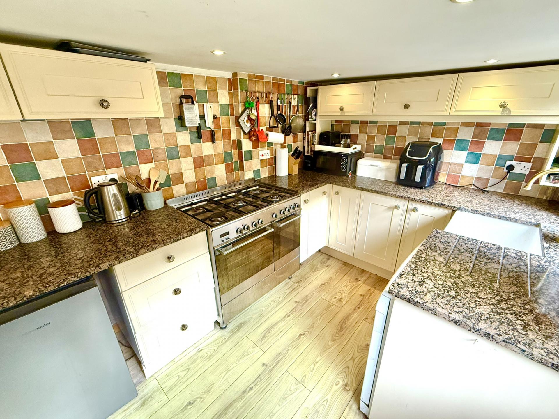 A picket fenced front garden is accessed from the hard standing area with a paved path leading up to a central front door, which opens into the main living room. The living room benefits from a large inglenook fireplace at one end with two front facing windows, exposed wooden flooring and ceiling joists. At the opposite end of the living room is access to a ground floor shower room /WC while to the rear of the living room is access through to the kitchen. The kitchen benefits from rear facing windows as well as glazed back door and is fitted with cream shaker units, with granite worktops, butlers sink, space for range cooker, plumbing and space for dishwasher and under counter fridge. A connecting utility room provides further cream shaker units with laminate worktops, second butlers sink and space and plumbing for a washing machine and further under counter freezer.