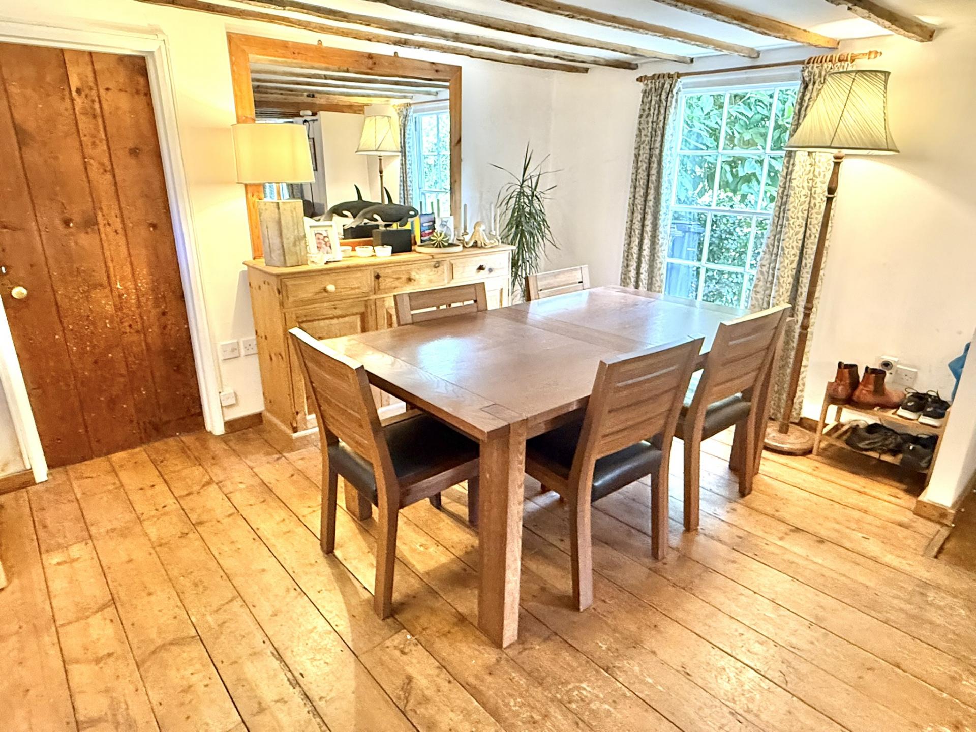 Description: The Farthings is a welcoming detached late Georgian Grade II listed house that we understand was originally constructed in the early 1800’s and which has then been extended at the rear. The original property is of timber frame construction with weatherboard elevations while at the rear is a mix of brick tile hung and weather board elevations with a mix of timber sash and timber casement frame windows beneath a pitched slate tiled roof at the front and felt flat roof at the rear.