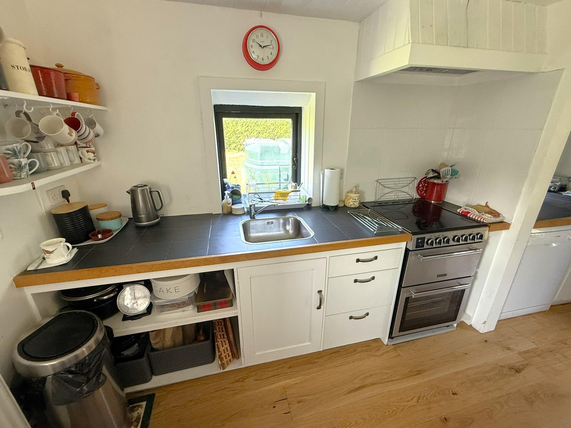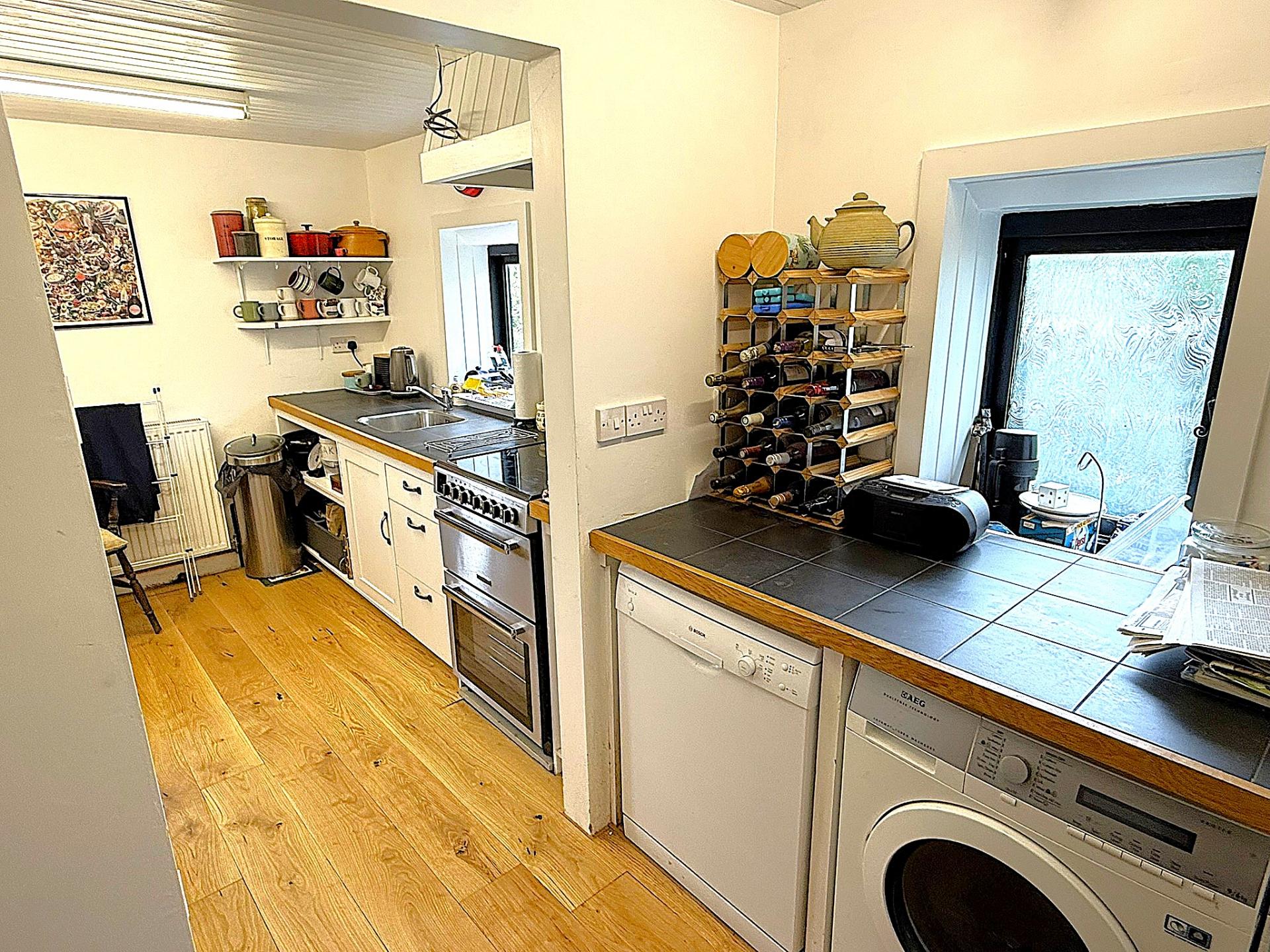 Accessed from the living room is a door leading through to a rear entrance hall with back door / utility room, with plumbing for a washing machine and dishwasher and space for large fridge / freezer. The kitchen connects through from the utility area with double aspect windows, white shaker style units with tiled worktops, a stainless steel sink and space for an electric cooker and under counter tumble dryer.