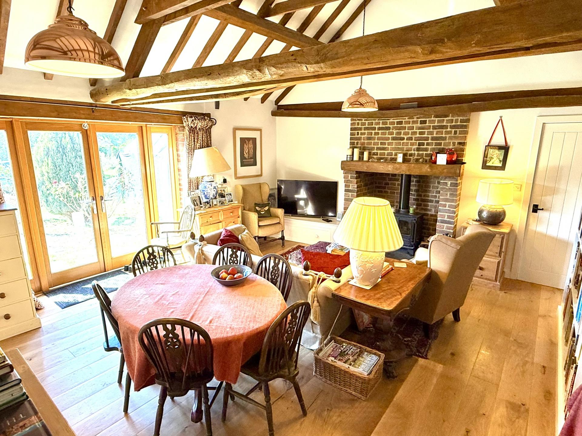 A charming, detached 2 bedroom barn conversion with separate detached large double garage and workshop all set in a generous wrap around garden in a quiet village location opposite the pretty church of St. Mary’s Udimore.