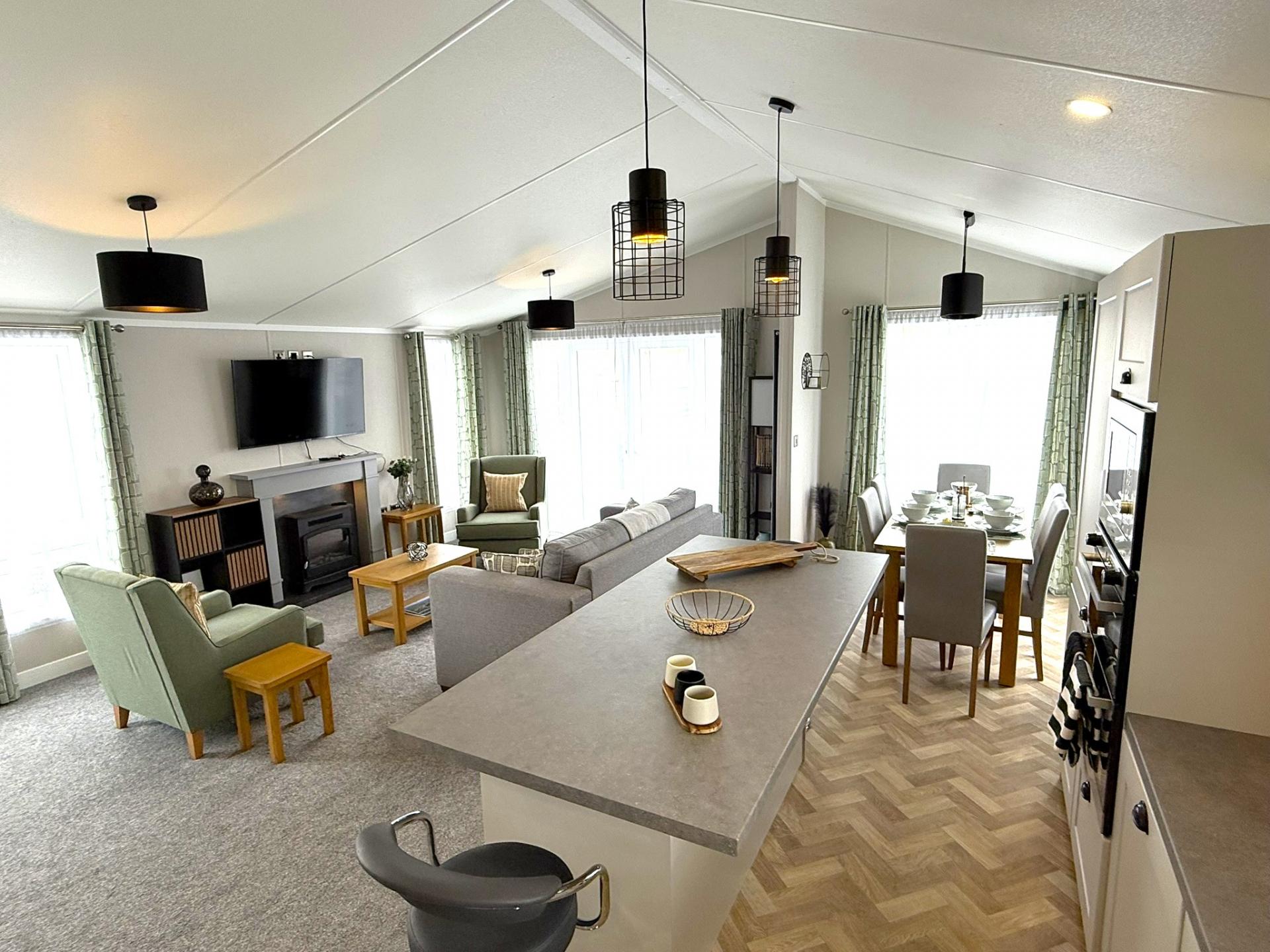 Description: 32 Stanford Way is a brand new 2025 Sunseeker, Sensation 40 x 20, two bedroom park lodge holiday home with an abundance of natural light, comprehensively fitted, and situated close to the sea within the Rye Harbour Coastal and Country Park. The property is accessed via four steps leading up on to a raised decking veranda, and the front door, which opens into an open plan kitchen dining / living room. The kitchen is comprehensively fitted with light grey shaker style units with laminate worktops, black composite sink, gas hob, with extractor hood above, integral microwave, double electric oven, integrated dishwasher, washer / dryer, wine fridge and fridge / freezer. A large island unit with breakfast bar separates the kitchen from the dining area and living area with triple aspect windows including French doors opening out onto the decked terrace, mock fireplace & surround incorporating an electric fire heater and above a 52” TV.