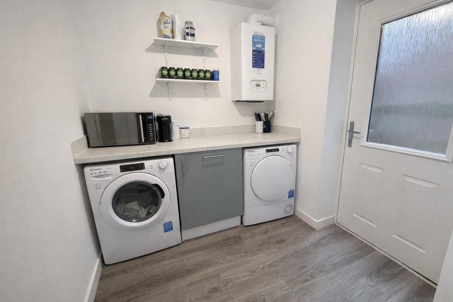 Utility Room - 2.19 x 2.09 (7'2" x 6'10") - Composite door to side access, laminate work surface, wall mounted gas boiler, plumber for washing machine, central heating radiator and under stairs cupboard.