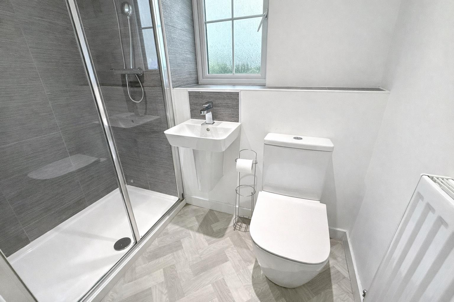 Ensuite - 1.51 x 2.01 (4'11" x 6'7") - Enclosed shower cubicle, WC, wash hand basin, tiled splashbacks, central heating radiator, inset spotlights, extractor fan and Upvc window to side aspect.
