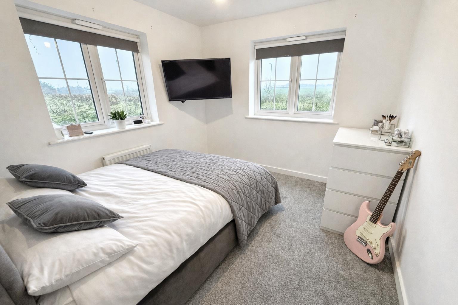 Bedroom One - 4.27 x 4.14 (14'0" x 13'6") - Upvc windows to front and side aspects with open views, central heating radiator, fitted wardrobes with mirrored doors door to ensuite.