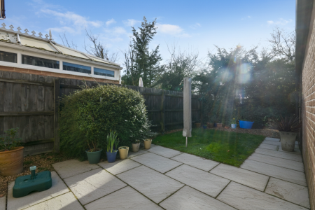 The property enjoys a private, low-maintenance rear garden which is predominantly laid to lawn with a paved patio area perfect for outdoor entertaining. A side driveway provides off-road parking and leads to a detached garage equipped with an up-and-over door and light and power connected. The front of the property is complemented by a neat lawned area and a covered porch entrance.