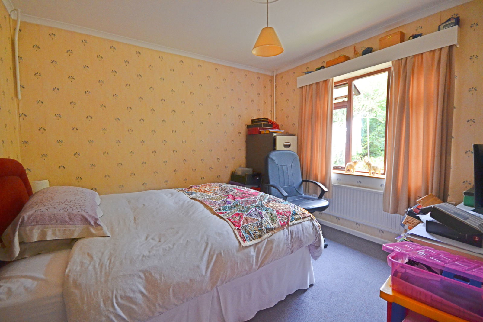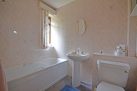 The remainder of the home consists of three generous double bedrooms. The principal bedroom is particularly spacious with built-in storage, while the third bedroom is currently utilised as a storeroom and offers flexibility for a home office or hobby room. The accommodation is completed by a fully tiled family bathroom comprising a panelled bath with shower attachment, pedestal wash hand basin, and WC.