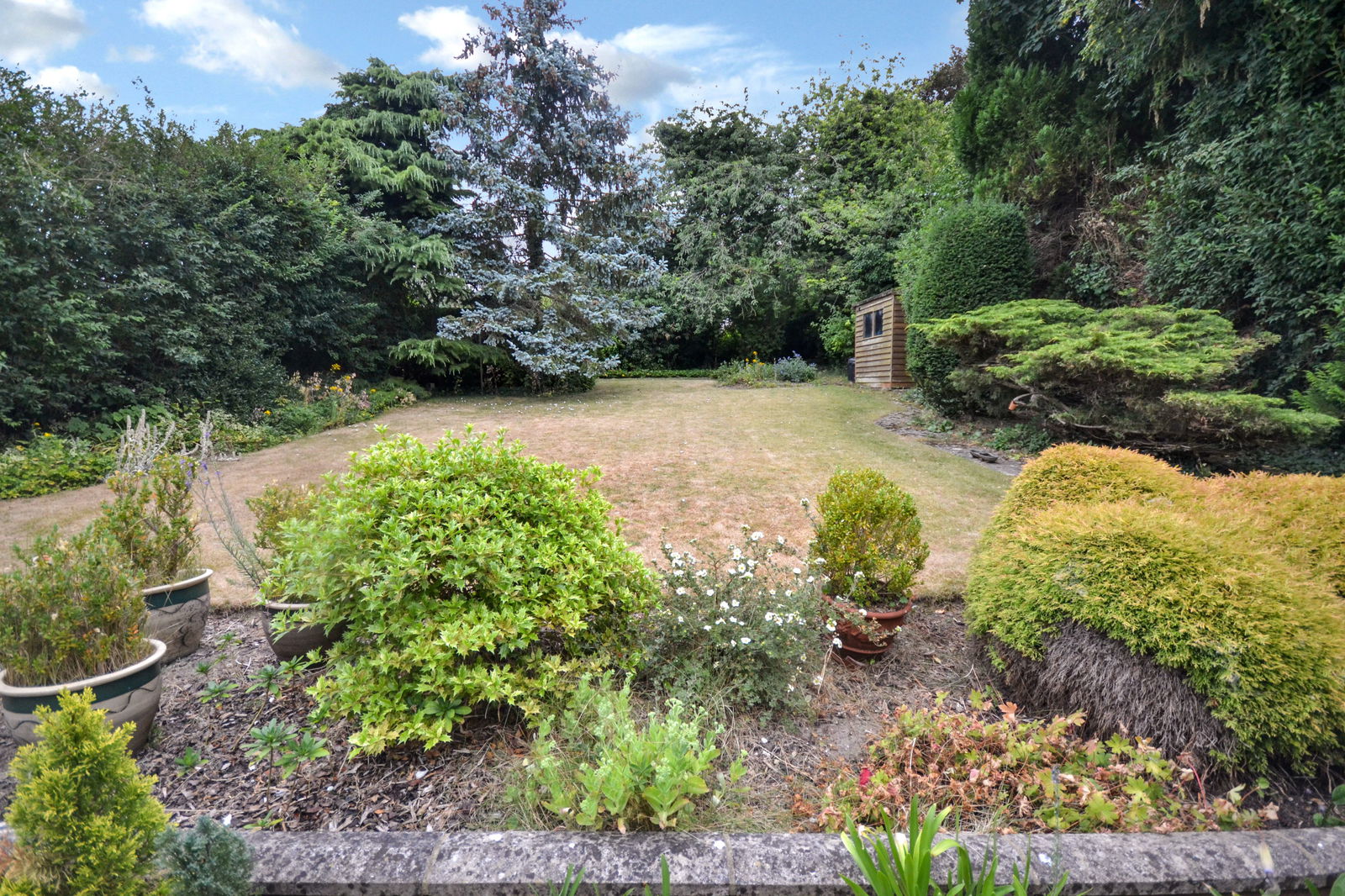 The property is nestled behind a charming front garden, primarily laid to lawn and punctuated by mature planting and a stately conifer, providing an attractive set-back from the road. A private driveway offers convenient off-road parking and leads to a single garage. To the rear lies a generously proportioned, enclosed garden, a particular feature of the home. This expansive outdoor space is mainly laid to lawn, bordered by an array of mature trees, shrubs, and established planting that ensure a high degree of privacy. A paved patio area extends directly from the conservatory and dining room, creating an ideal spot for alfresco entertaining. Additionally, a winding path leads to a substantial garden shed, providing excellent external storage or workshop potential.