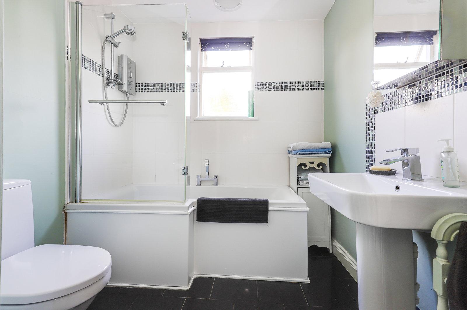 Comprising of bath with shower attachment over and glass screen, wash hand basin, WC, window to the rear aspect, ladder radiator.