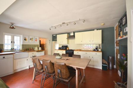 Country style kitchen fitted with a range of base and eye level units with solid oak work surface incorporating a ceramic butler sink. There is space for an electric cooker with extractor above, space for a fridge and a dishwasher, tiled splash back, tiled flooring, large pantry cupboard and a large storeroom with plumbing for a washing machine (6'7" x 5'7). The kitchen opens through to: