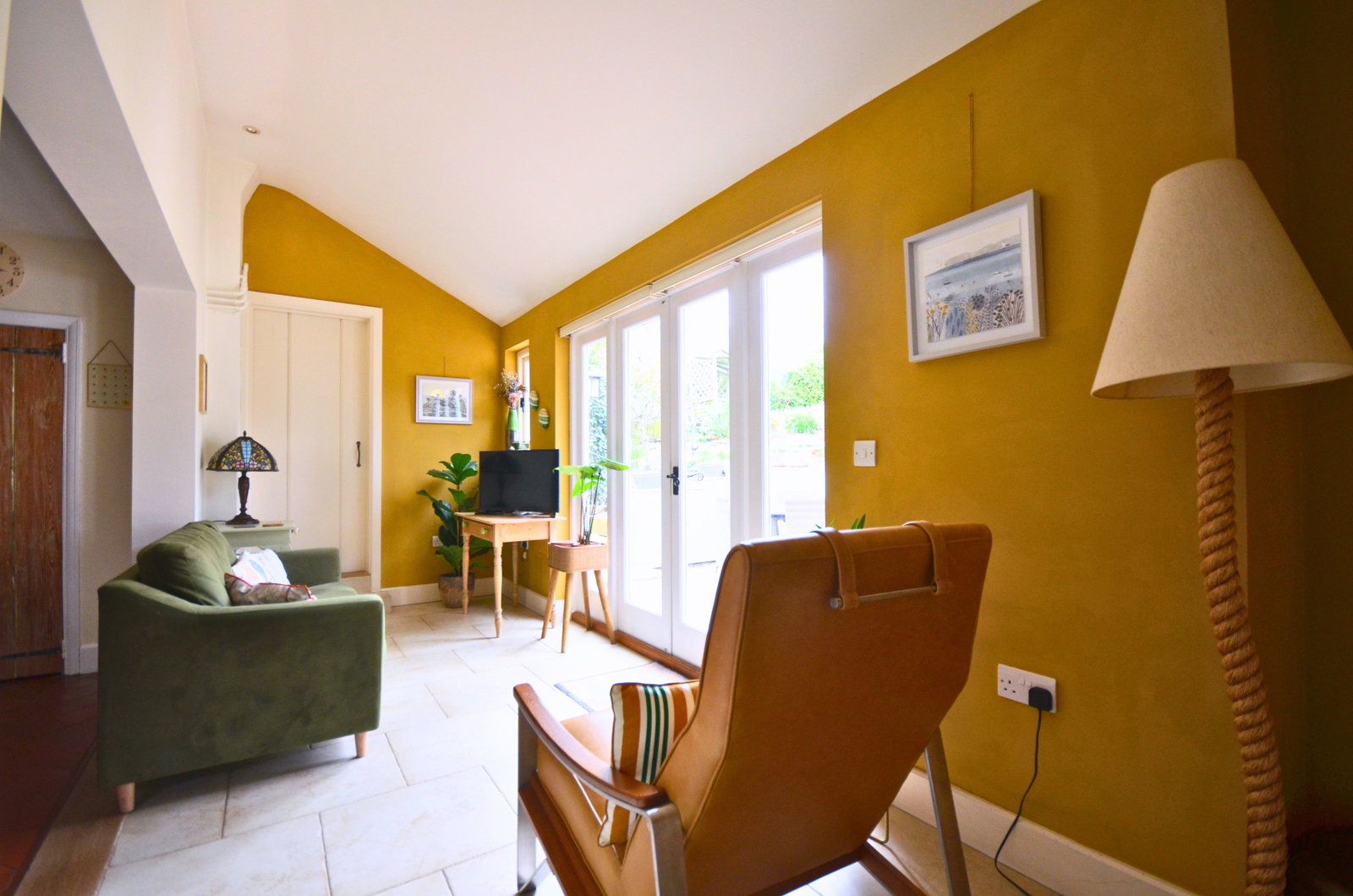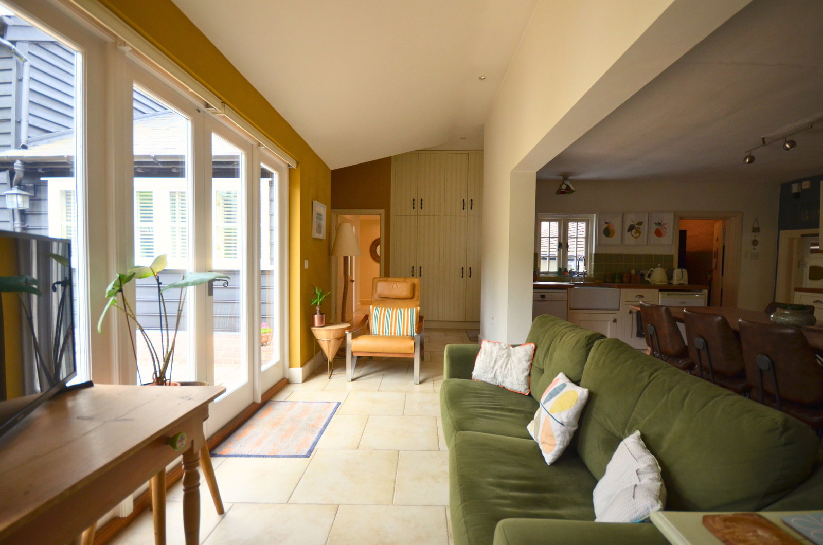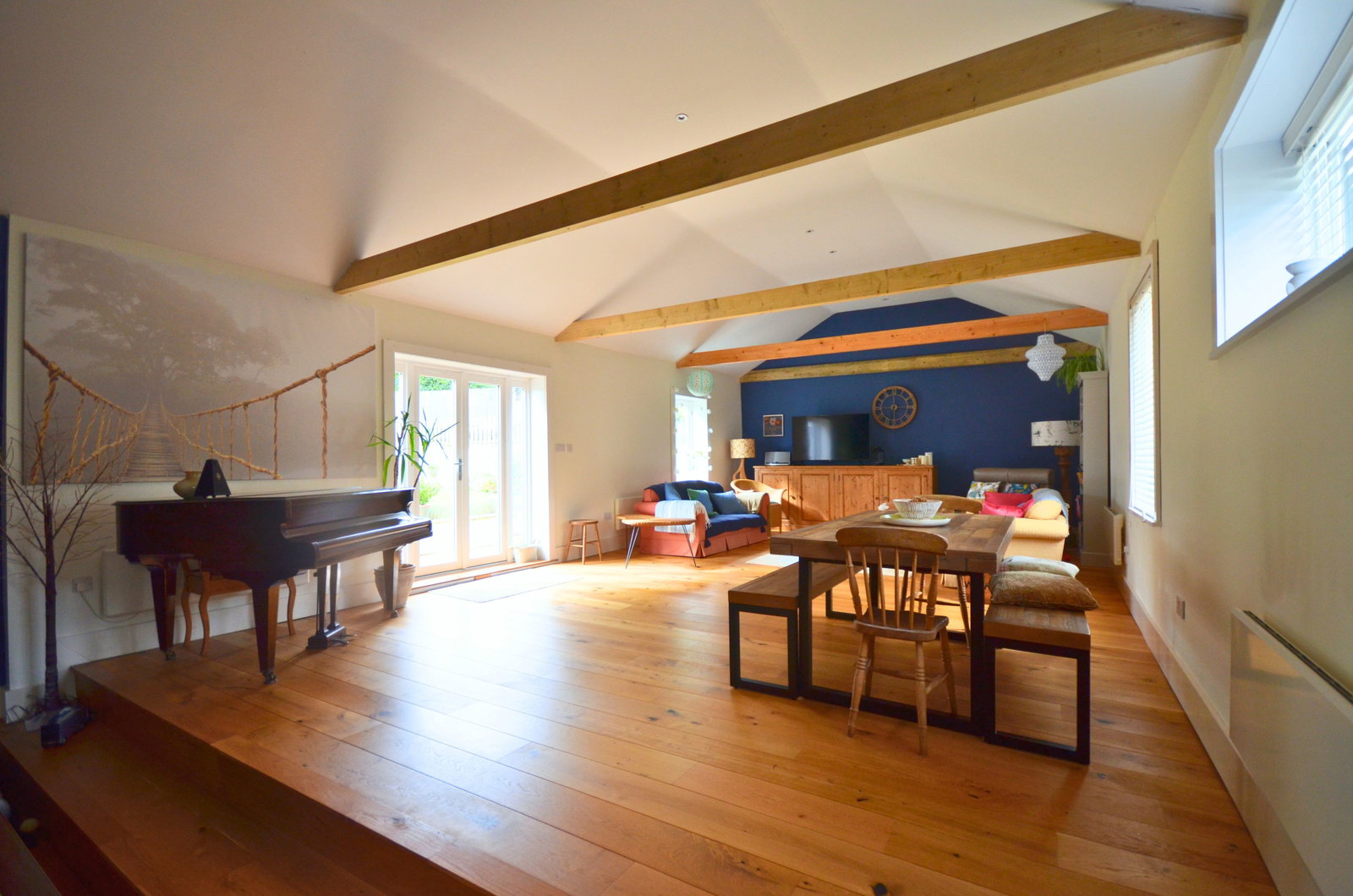 Vaulted room set over two levels, with three windows to one side and another large window and French doors to the other, providing access to the rear garden. The room benefits from oak engineered flooring throughout, and 4 wall mounted electric storage heaters.