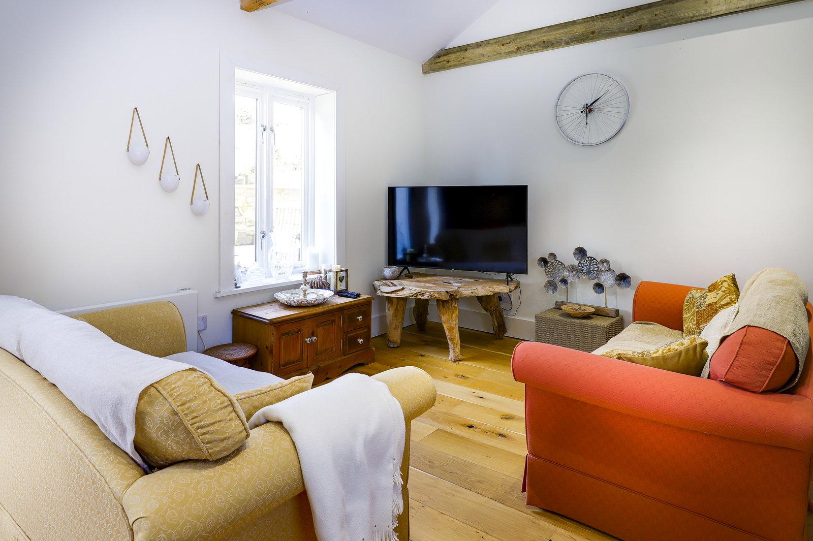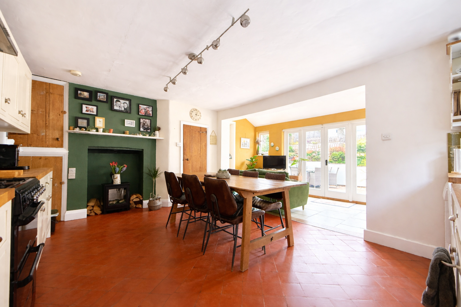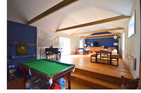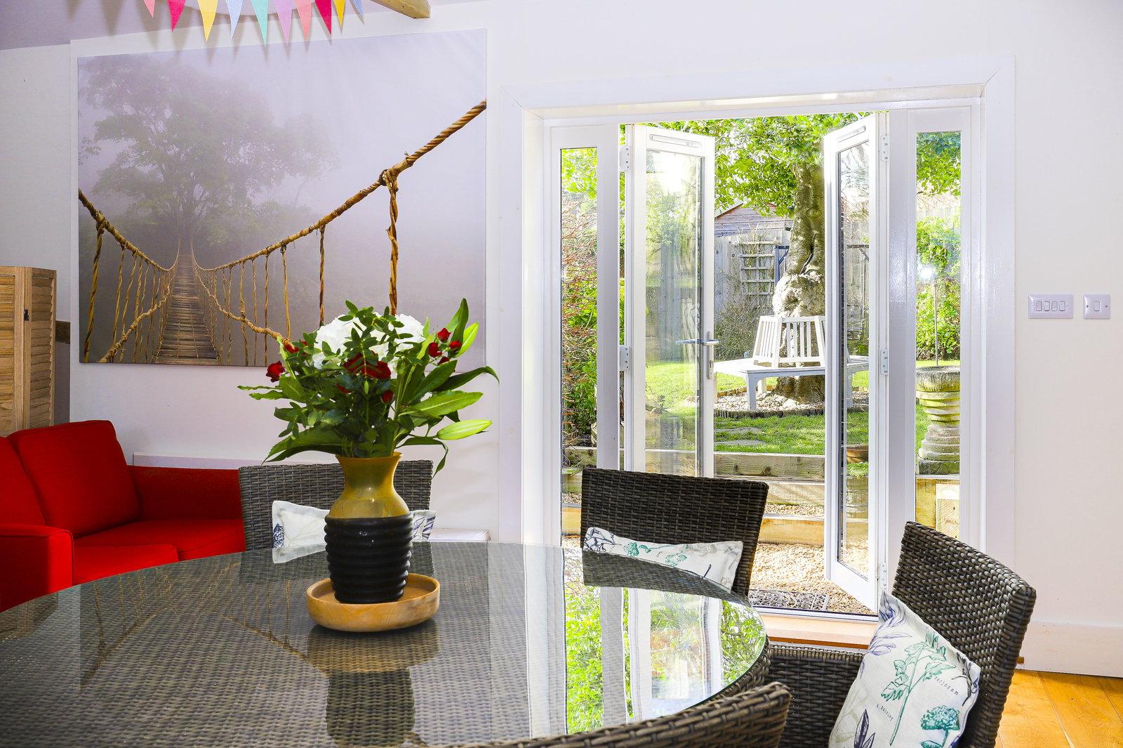 Vaulted room set over two levels, with three windows to one side and another large window and French doors to the other, providing access to the rear garden. The room benefits from oak engineered flooring throughout, and 4 wall mounted electric storage heaters.
