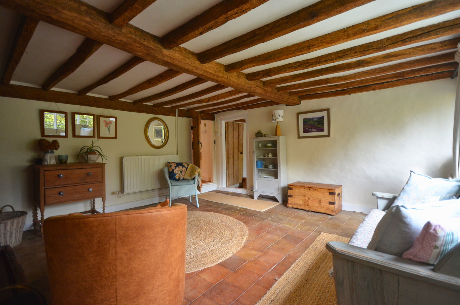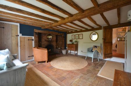 Attractive stone flooring, original brick inglenook fireplace, tiled hearth, exposed timbers, under stairs storage cupboard, original window to front aspect with secondary glazing, stairs rising to first floor, doors to: