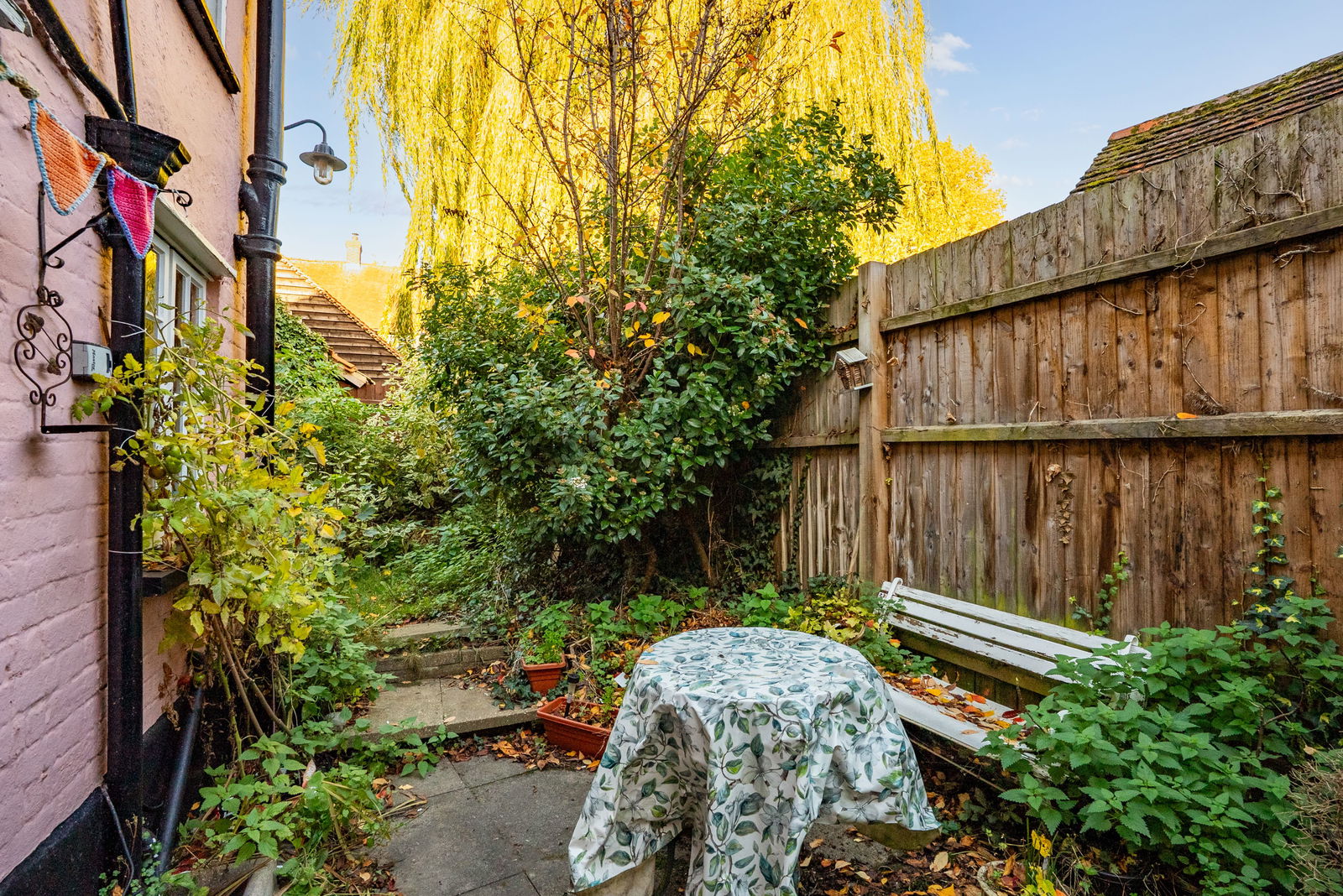 To the rear, the property enjoys a private courtyard-style garden with access to a detached outbuilding offering two separate storage rooms—ideal for bikes, tools, or potential studio space. The peaceful outdoor setting provides a quiet retreat in the heart of the town, just moments from the shops, cafés, and green spaces that make Saffron Walden such a desirable place to live.