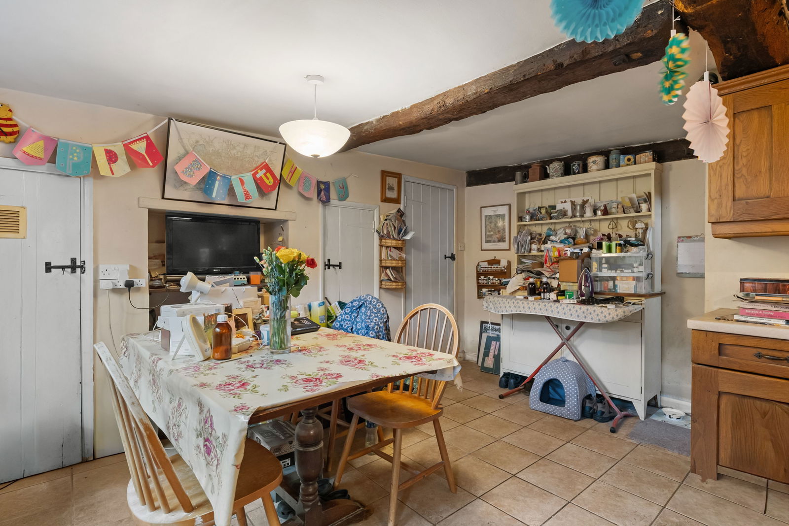 The ground floor opens into a welcoming sitting room featuring a front-facing window that brings in excellent natural light and highlights the character of the space, including a central fireplace. This leads through to a charming dining area with a window to the side aspect and opening to the kitchen. Located at the rear, the kitchen includes a rear-aspect window overlooking the garden and a side door providing access to the outside—offering a bright, functional space ideal for day-to-day living.