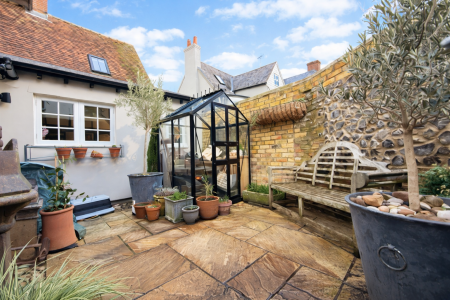 - A low-maintenance rear garden featuring sandstone paving and flint-and-brick walling